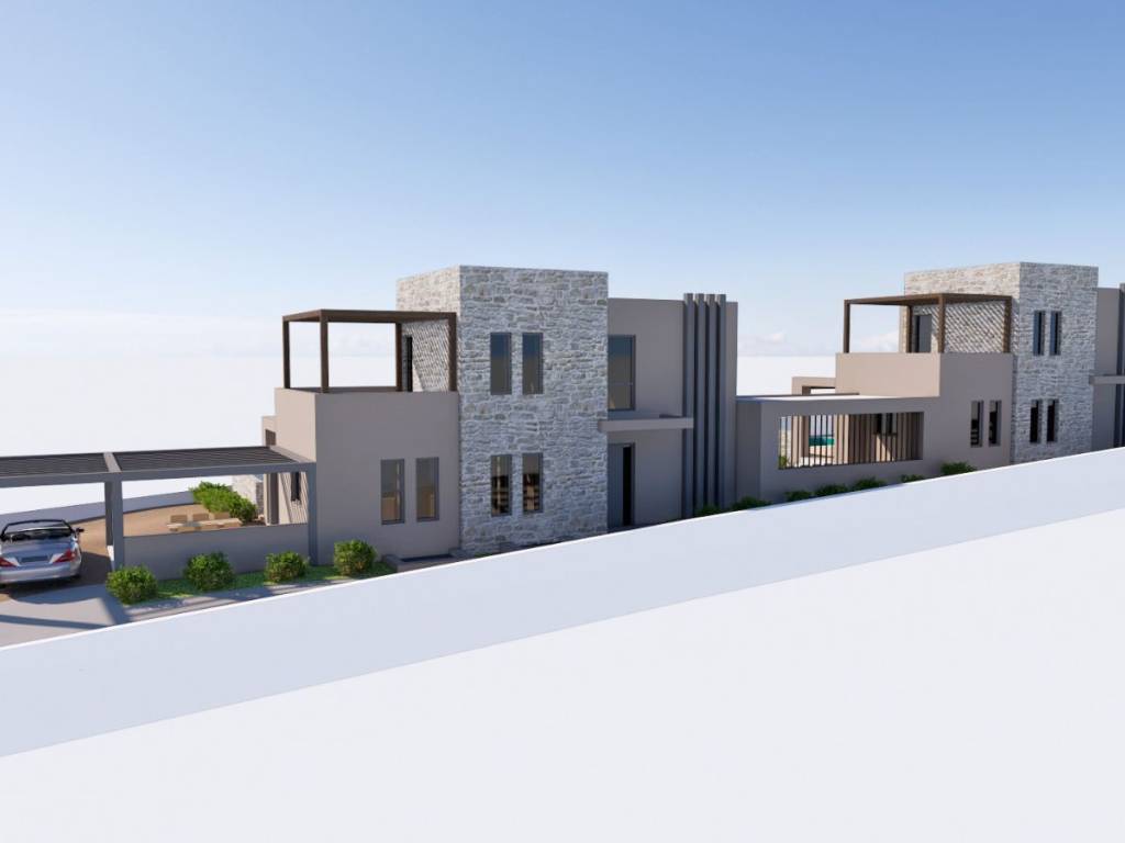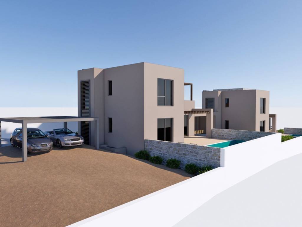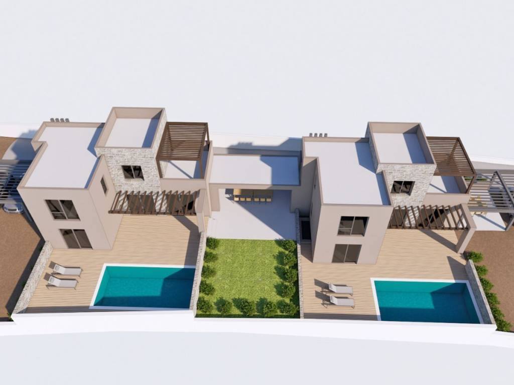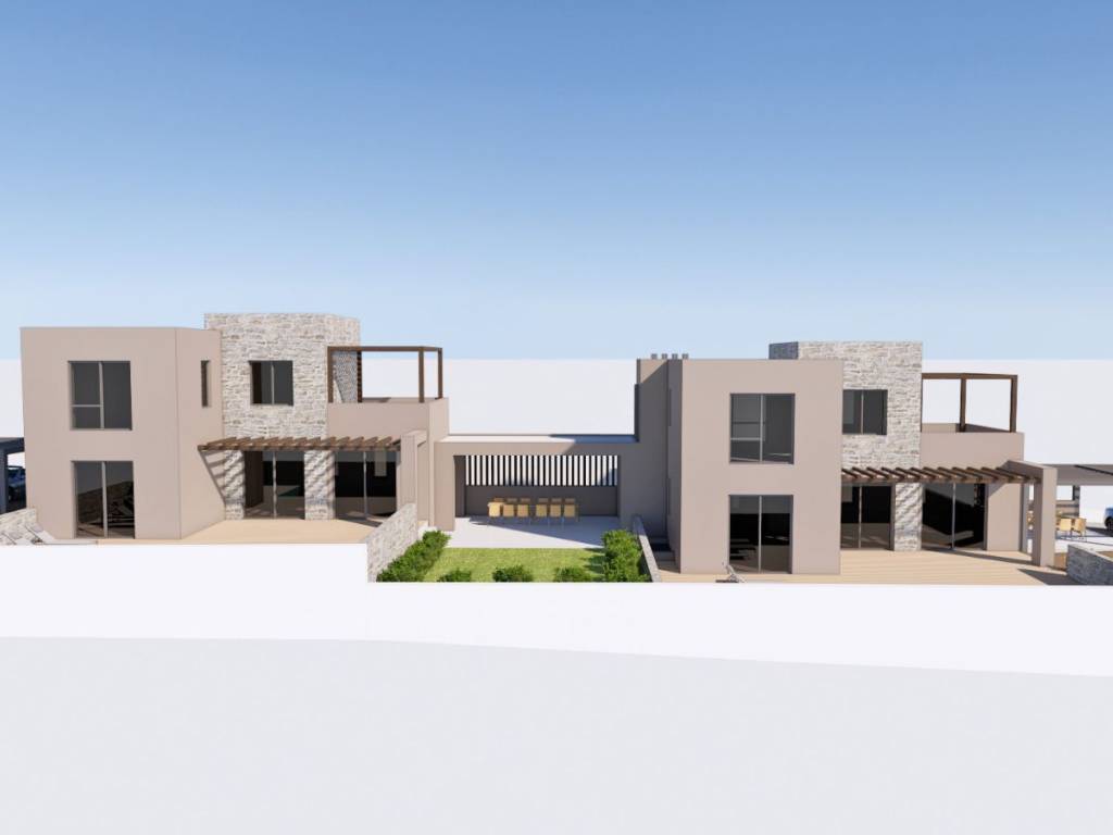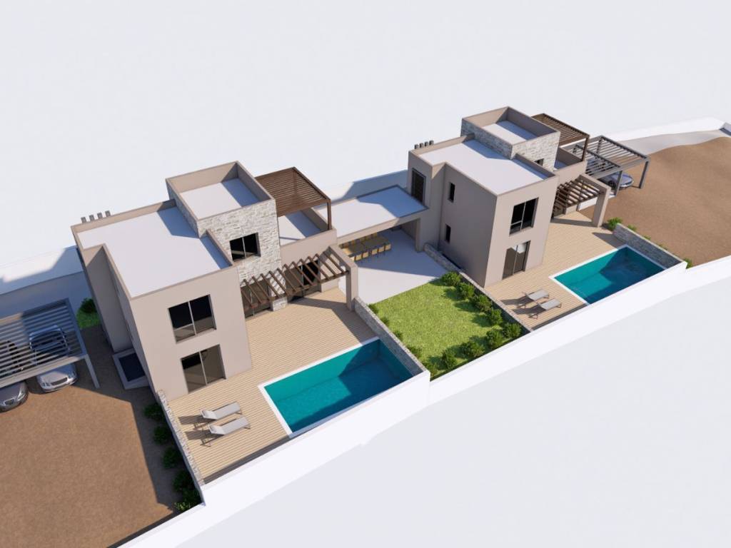 Lovely plot for sale at the outskirts of Darmarohori village, surrounded by a sea of olive groves, enjoying views over the mountains and the rolling hills!! This plot of 1,784,94m2 includes a building permission for two independent villas, each of 137,94m2, each with a private swimming pool of 29,25m2, and each with a private basement of 73,66m2! The villas are designed on two levels and are attached by a covered area. The ground floors consist of a spacious open plan kitchen / living room, a bathroom with a wall-to-wall shower and a double bedroom with sliding patio doors opening onto the sun terraces surrounding the swimming pool. Internal staircases lead to the lower floor which will be the basement, and the upper floors which will consist of a landing hall, a shared bathroom with wall-to-wall shower, and two double bedrooms, one of which has patio doors opening onto a spacious balcony! 384m2 of the plot will be used as a common access for the villas and each villa with have exclusive use of 700m2 of land. Most probably from the second floor of the villas, there will also be some sea views along with the mountain views. All documentation is in place and the future owner of the land could start the construction process immediately! Access is provided easily by the main asphalt road, while water and electricity and found on site. The land is long and narrow and has a very slight slope towards the east and then another very slight slope towards the west, providing tranquil rural views of the hills, villages and mountains and making the construction process easy. FEATURES • Existing building permit for 2 villas with pools • Entirely planted with olive trees • Electricity on site • Short distance to amenities and beaches DISTANCES • From mini market: 3,3km / 5 min drive • From tavern: 600m / 8 min walk • From beach: 3,8km / 6 min drive • From nearest town: 4,7km / 6 min drive • From Chania Center: 27,5km / 30 min drive • From airport: 43,4km / 45 min drive