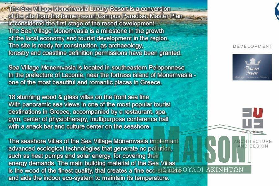 Μονεμβασιά, Παραθαλάσσια εκταση με δυνατότητα ΑΝΕΓΕΡΣΗΣ ΞΕΝΟΔΟΧΕΙΑΚΗΣ ΜΟΝΑΔΑΣ SEA VILLAGE LUXURY VILLAS BOUTIQUE HOTEL, 18 μοντερνες βίλες από ξύλο & γυαλί, ιδιωτικές πισίνες & μπροστά στη θάλασσα.Το συγκρότημα διαθέτει εστιατόριο , αίθουσα με snack bar, κέντρο φυσιοθεραπείας,SPA, γυμναστήριο , οικολογική φάρμα,κ.α. Η συνολική έκταση είναι 17,174τμ . Το συγκρότημα αποτελείται από οικίες μοντέρνας αρχιτεκτονικής, 14 εκ των οποίων είναι με 3 υ/δ ( μεζονέτες 183,6τμ συνολικής επιφάνειας,1 υ/δ master, ξύλινα πατώματα ,με μπαλκόνια,wc, 2 μπάνιο, καθιστικό , τραπεζαρία.κουζίνα, ιδιωτική πισίνα, κήπο,bbq, θέσεις στάθμευσης),και 4 με 4υ/δ ( μεζονέτες 215τμ συνολικής επιφάνειας, 1 master υ/δ με θεα θάλασσα, 7μτ ιδιωτική πισίνα ξύλινα πατώματα, , μπαλκόνια, wc, μπάνια,καθιστικό, τραπεζαρία , κυζίνα, κήπο , bbq, θέσεις στάθμευσης).Ενεργειακή κλάση A+, κωδικός ακινήτου: 18345, www.maison-estate.gr