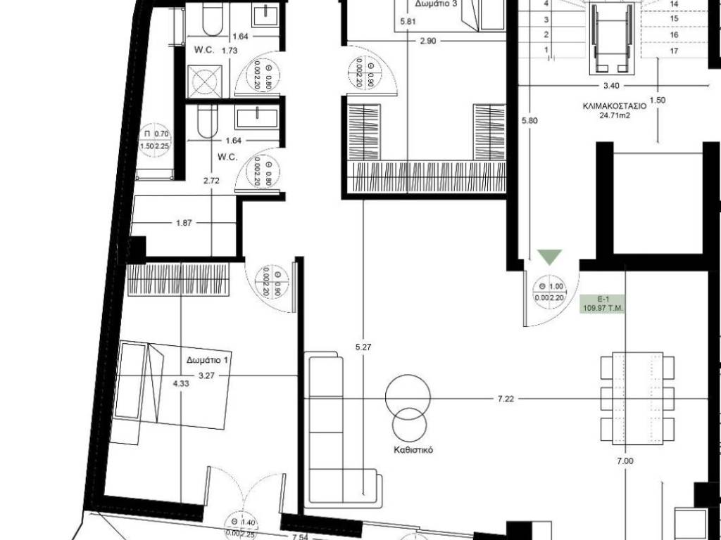 Κτίριο σύγχρονων κατοικιών σε πολύ κεντρικό σημείο επί της οδού 23ης Οκτωβρίου ,σχεδιασμένο στα πρότυπα του βιοκλιματικού σχεδιασμού. Ένα 4άρι με πολύ άνετα δωμάτια μεγάλους κοινόχρηστους χώρους κουζίνα και σαλόνι-καθιστικό καθώς και δυο άνετα μπάνια χωρίς καθόλου χαμένους χώρους και διαδρόμους. Οι προδιαγραφές της κατασκευής υπερβαίνουν σημαντικά τις απαιτήσεις του κανονισμού με καθώς χρησιμοποιείτε για την κατασκευή του φέροντα οργανισμού οπλισμένο σκυρόδεμα C30/37. Τοιχοποιία συνολικής μόνωση 30εκ. εξολοκλήρου με Ορθοblock 20εκ. που εντάσσονται στην κατηγορία θερμομονωτικών στοιχείων πλήρωσης και εξωτερική μόνωση 10 εκ. έτσι ο ενεργειακός σχεδιασμός του κτηρίου ελαχιστοποιεί τις απαιτήσεις κατανάλωσης ενέργειας για θέρμανση και ψύξη. Εξωτερικά κουφώματα αλουμινίου με υψηλά επίπεδα θερμομόνωσης και ηχομόνωσης με ρολά και σίτες στο χρώμα των κουφωμάτων. Θέρμανση με ατομικό λέβητα φυσικού αερίου.