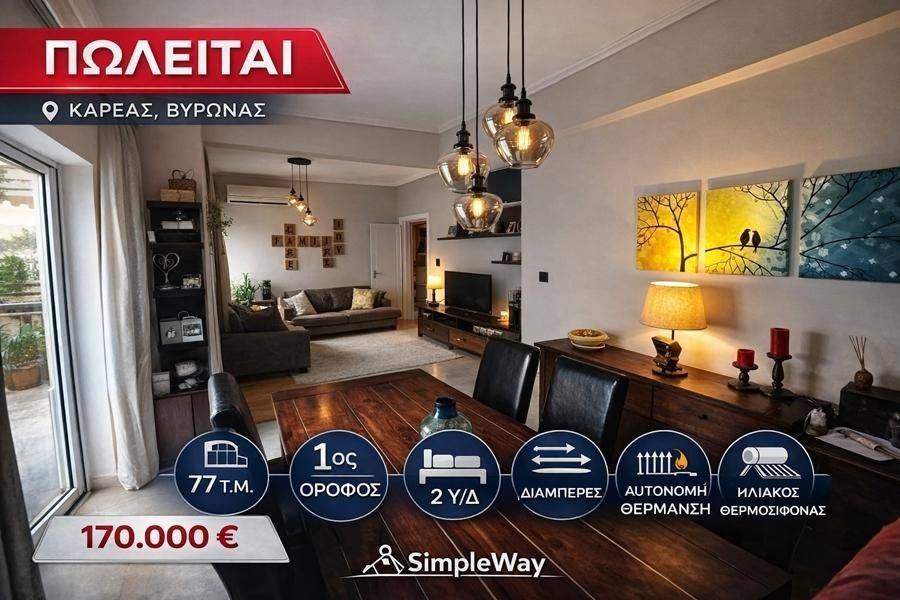 ΒΥΡΩΝΑΣ, Καρέας - Διαμέρισμα 77τμ, 2 υ/δ, 1ος, κατασκευή 1979, ανακαίνιση 2019, ενεργειακή κλάση Η, σαλόνι, κουζίνα, μπάνιο, αυτόνομη θέρμανση (ηλεκτρικό ρεύμα), κλιματισμός, ηλιακός, βεράντες, κουφώματα αλουμινίου, τύπος δαπέδων μάρμαρο & ξύλο, νυχτερινό ρεύμα, πόρτα ασφαλείας, οικιστική ζώνη. Για την καλύτερη εξυπηρέτηση σας, παρακαλώ προτιμάτε να αποστέλλετε μήνυμα ενδιαφέροντος μέσω της σελίδας αγγελιών και θα επικοινωνήσουμε σύντομα μαζί σας. Εναλλακτικά μπορείτε να μας καλείτε καθημερινά Δευτέρα - Παρασκευή 10:00-16:30 στα τηλέφωνα 2100102835 & 6934867725. Πωλείται Διαμέρισμα 77 τ.μ. στον Καρέα Βύρωνα Τιμή: 170.000 € Πωλείται οροφοδιαμέρισμα πρώτου ορόφου, γωνιακό, διαμπερές και ιδιαίτερα φωτεινό, συνολικού εμβαδού 77 τ.μ., σε κεντρικό σημείο του Καρέα Βύρωνα. Το ακίνητο διαθέτει περιμετρικά μπαλκόνια, προσφέροντας άνεση και φυσικό φωτισμό σε όλους τους χώρους. Αποτελείται από δύο υπνοδωμάτια, ένα μπάνιο, ευρύχωρο σαλόνι–τραπεζαρία και ξεχωριστή κουζίνα, η οποία διαθέτει και δικό της μικρό μπαλκόνι. Το μπάνιο έχει ανακαινιστεί το 2019, με νέα υδραυλική εγκατάσταση και πίνακα υδροληψίας, ενώ έχουν τοποθετηθεί και δύο νέα κουφώματα. Χαρακτηριστικά ακινήτου: 1ος όροφος Ενεργειακή κλάση Η Αυτόνομη θέρμανση με ατομική εγκατάσταση (ρεύμα) Αναμονές για θέρμανση πετρελαίου Κλιματισμός Ηλιακός θερμοσίφωνας Πόρτα ασφαλείας Μαρμάρινα δάπεδα στους κύριους χώρους Παρκέ στα υπνοδωμάτια Ιδανική επιλογή τόσο για ιδιοκατοίκηση όσο και για επενδυτική αξιοποίηση, σε σημείο με άμεση πρόσβαση σε μέσα μεταφοράς και βασικές υποδομές. ΜΕΣΙΤΙΚΟ ΓΡΑΦΕΊΟ SIMPLE WAY Λ.ΚΑΡΕΑ 64 ΤΚ:16233 ΤΗΛ:2100102835 / 6934867725 10:00-16:30 Εγγραφείτε στο κανάλι μας στο YouTube για να μαθαίνετε πρώτοι τις νέες μας αγγελίες . https://www.youtube.com/channel/UCY93CoY5bQNcrY3589xgnjg Τιμή €170.000 (κωδ. 1443) 2100102835, 6975589741 SIMPLEWAY REAL ESTATE