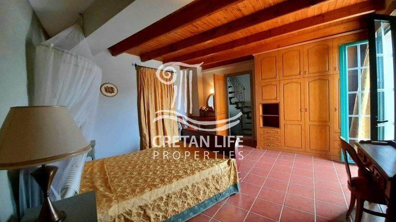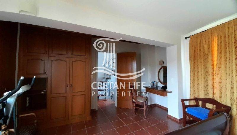 Η κατοικία διαθέτει κλιματιστικά σε όλους τους χώρους, τζάκι, ηλιακό θερμοσίφωνα, εντοιχισμένες ντουλάπες, κουφώματα αλουμινίου με διπλά τζάμια και σίτες, καθώς και δάπεδα από πλακάκι. Ο εσωτερικός σχεδιασμός αναδεικνύει τον έντονο ισπανικό χαρακτήρα του ακινήτου, μέσα από επιλεγμένα διακοσμητικά στοιχεία και φυσικά υλικά όπως ξύλο, πέτρα, γυαλί και μέταλλο, δημιουργώντας αίσθηση πολυτέλειας, ζεστασιάς, άνεσης και απόλυτης σύνδεσης με τη φύση. Τα μεγάλα τοξωτά παράθυρα εξασφαλίζουν άπλετο φυσικό φως, ενώ οι ορατές ξύλινες δοκοί, τα διακοσμητικά πλακάκια, οι πίνακες και οι καθρέφτες σύγχρονου σχεδιασμού προσδίδουν μοναδική αισθητική και χαρακτήρα.