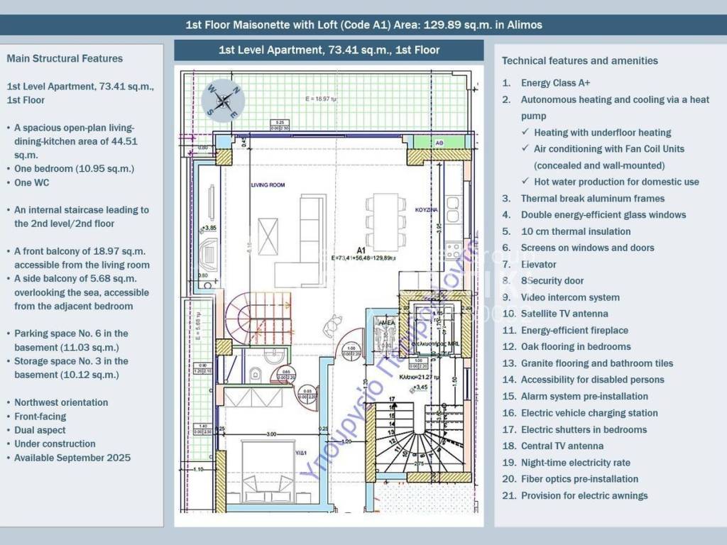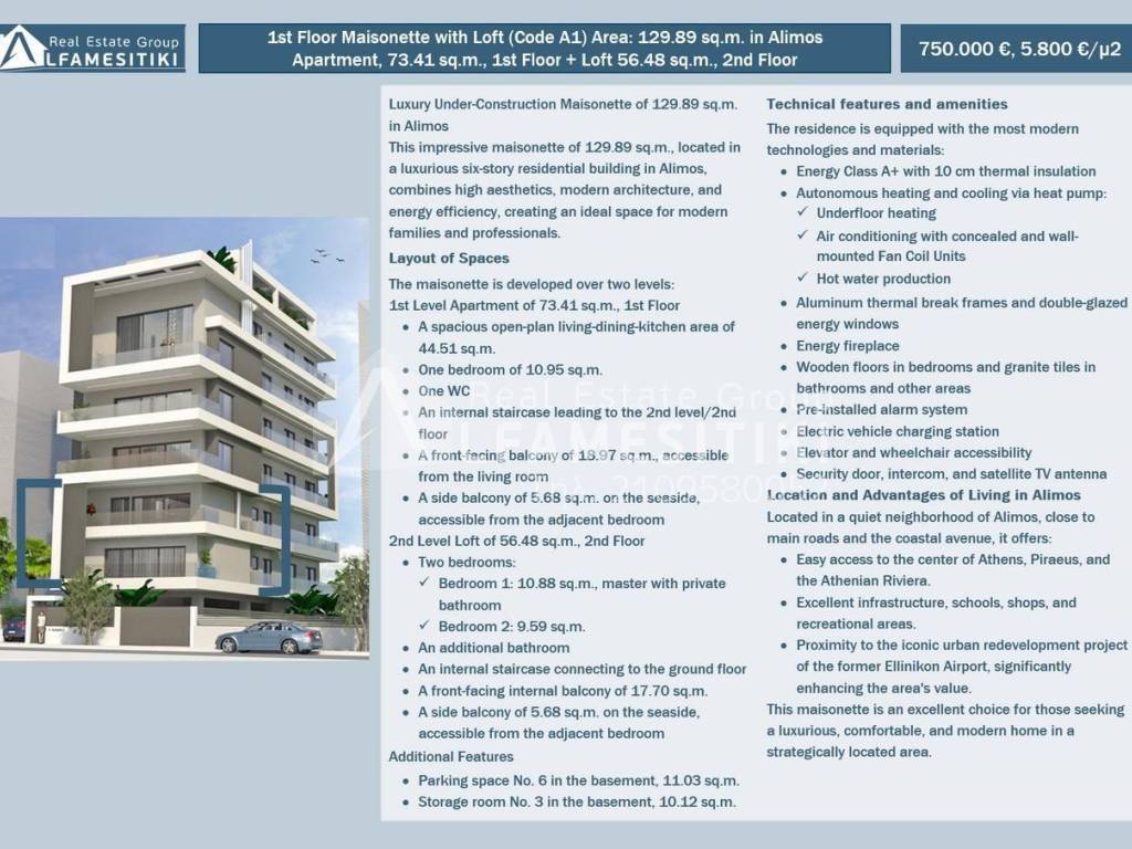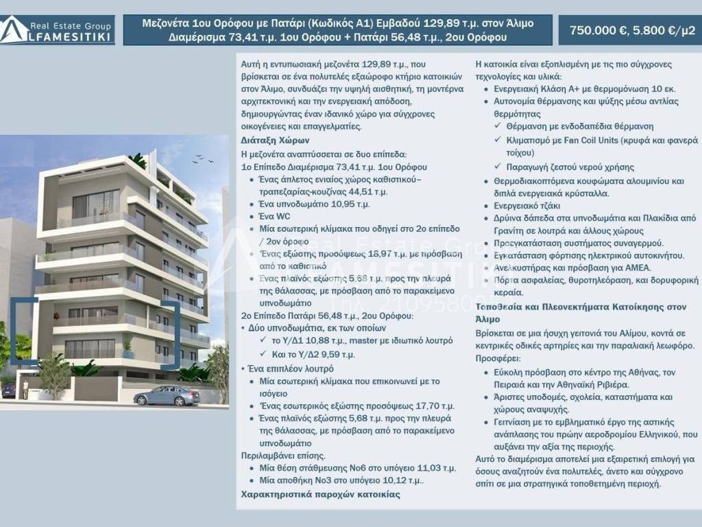 Αυτή η εντυπωσιακή μεζονέτα 129,89 τ.μ., που βρίσκεται σε ένα πολυτελές εξαώροφο κτήριο κατοικιών στον Άλιμο, συνδυάζει την υψηλή αισθητική, τη μοντέρνα αρχιτεκτονική και την ενεργειακή απόδοση, δημιουργώντας έναν ιδανικό χώρο για σύγχρονες οικογένειες και επαγγελματίες. Διάταξη Χώρων Η μεζονέτα αναπτύσσεται σε δυο επίπεδα: 1o Επίπεδο Διαμέρισμα 73,41 τ.μ. 1ου Ορόφου Ένας άπλετος ενιαίος χώρος καθιστικού–τραπεζαρίας-κουζίνας 44,51 τ.μ. Ένα υπνοδωμάτιο 10,95 τ.μ. Ένα WC Μία εσωτερική κλίμακα που οδηγεί στο 2ο επίπεδο / 2ον όροφο ‘Ένας εξώστης προσόψεως 18,97 τ.μ. με πρόσβαση από το καθιστικό Ένας πλαϊνός εξώστης 5,68 τ.μ. προς την πλευρά της θάλασσας, με πρόσβαση από το παρακείμενο υπνοδωμάτιο 2o Επίπεδο Πατάρι 56,48 τ.μ., 2ου Ορόφου: Δύο υπνοδωμάτια, εκ των οποίων το Υ/Δ1 10,88 τ.μ., master με ιδιωτικό λουτρό Και το Υ/Δ2 9,59 τ.μ. Ένα επιπλέον λουτρό Μία εσωτερική κλίμακα που επικοινωνεί με το ισόγειο ‘Ένας εσωτερικός εξώστης προσόψεως 17,70 τ.μ. Ένας πλαϊνός εξώστης 5,68 τ.μ. προς την πλευρά της θάλασσας, με πρόσβαση από το παρακείμενο υπνοδωμάτιο Περιλαμβάνει επίσης. Μία θέση στάθμευσης Νο6 στο υπόγειο 11,03 τ.μ. Μία αποθήκη Νο3 στο υπόγειο 10,12 τ.μ.. Χαρακτηριστικά παροχών κατοικίας Η κατοικία είναι εξοπλισμένη με τις πιο σύγχρονες τεχνολογίες και υλικά: Ενεργειακή Κλάση Α+ με θερμομόνωση 10 εκ. Αυτονομία θέρμανσης και ψύξης μέσω αντλίας θερμότητας Θέρμανση με ενδοδαπέδια θέρμανση Κλιματισμό με Fan Coil Units (κρυφά και φανερά τοίχου) Παραγωγή ζεστού νερού χρήσης Θερμοδιακοπτόμενα κουφώματα αλουμινίου και διπλά ενεργειακά κρύσταλλα. Ενεργειακό τζάκι Δρύινα δάπεδα στα υπνοδωμάτια και Πλακίδια από Γρανίτη σε λουτρά και άλλους χώρους Προεγκατάσταση συστήματος συναγερμού. Εγκατάσταση φόρτισης ηλεκτρικού αυτοκινήτου. Ανελκυστήρας και πρόσβαση για ΑΜΕΑ. Πόρτα ασφαλείας, θυροτηλεόραση, και δορυφορική κεραία. Τοποθεσία και Πλεονεκτήματα Κατοίκησης στον Άλιμο Βρίσκεται σε μια ήσυχη γειτονιά του Αλίμου, κοντά σε κεντρικές οδικές αρτηρίες και την παραλιακή λεωφόρο. Προσφέρει: Εύκολη πρόσβαση στο κέντρο της Αθήνας, τον Πειραιά και την Αθηναϊκή Ριβιέρα. Άριστες υποδομές, σχολεία, καταστήματα και χώρους αναψυχής. Γειτνίαση με το εμβληματικό έργο της αστικής ανάπλασης του πρώην αεροδρομίου Ελληνικού, που αυξάνει την αξία της περιοχής. Αυτό το διαμέρισμα αποτελεί μια εξαιρετική επιλογή για όσους αναζητούν ένα πολυτελές, άνετο και σύγχρονο σπίτι σε μια στρατηγικά τοποθετημένη περιοχή. ► ALFAMESITIKI Real Estate Group -- Μέλος Συλλόγου Μεσιτών - Πιστοποιημένο Μεσιτικό Γραφείο ► Για περισσότερες λεπτομέρειες σχετικά με το ακίνητο, το κτίριο ή την περιοχή καθώς και για την επίσκεψη του ακινήτου μπορείτε να επισκεφτείτε την σελίδα - https://www.alfamesitiki.gr/pdetails?id=Α-146271 ► Για ευκαιρίες σε παρόμοια ακίνητα και σε άλλες περιοχές με φωτογραφίες επισκεφτείτε τη σελίδα μας στο alfamesitiki.gr ► Τελευταία ενημέρωση 23/1/2026 ► Ακολουθήστε μας και στο Facebook www.facebook.com/alfamesitiki.gr