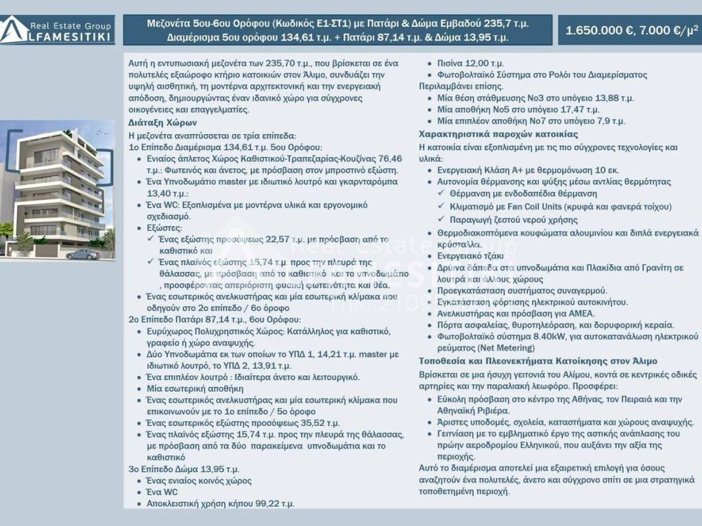 Αυτή η εντυπωσιακή μεζονέτα των 235 τ.μ., που βρίσκεται σε ένα πολυτελές εξαώροφο κτήριο κατοικιών στον Άλιμο, συνδυάζει την υψηλή αισθητική, τη μοντέρνα αρχιτεκτονική και την ενεργειακή απόδοση, δημιουργώντας έναν ιδανικό χώρο για σύγχρονες οικογένειες και επαγγελματίες. Διάταξη Χώρων Η μεζονέτα αναπτύσσεται σε τρία επίπεδα: 1o Επίπεδο Διαμέρισμα 134,61 τ.μ. 5ου Ορόφου: Ενιαίος άπλετος Χώρος Καθιστικού-Τραπεζαρίας-Κουζίνας 76,46 τ.μ.: Φωτεινός και άνετος, με πρόσβαση στον μπροστινό εξώστη. Ένα Υπνοδωμάτιο master με ιδιωτικό λουτρό και γκαρνταρόμπα 13,40 τ.μ.: Ένα WC: Εξοπλισμένα με μοντέρνα υλικά και εργονομικό σχεδιασμό. Εξώστες: Ένας εξώστης προσόψεως 22,57 τ.μ. με πρόσβαση από το καθιστικό και Ένας πλαϊνός εξώστης 15,74 τ.μ. προς την πλευρά της θάλασσας, με πρόσβαση από το καθιστικό και το υπνοδωμάτιο , προσφέροντας απεριόριστη φυσική φωτεινότητα και θέα. Ένας εσωτερικός ανελκυστήρας και μία εσωτερική κλίμακα που οδηγούν στο 2ο επίπεδο / 6ο όροφο 2o Επίπεδο Πατάρι 87,14 τ.μ., 6ου Ορόφου: Ευρύχωρος Πολυχρηστικός Χώρος: Κατάλληλος για καθιστικό, γραφείο ή χώρο αναψυχής. Δύο Υπνοδωμάτια εκ των οποίων το ΥΠΔ 1, 14,21 τ.μ. master με ιδιωτικό λουτρό, το ΥΠΔ 2, 13,91 τ.μ. Ένα επιπλέον λουτρό : Ιδιαίτερα άνετο και λειτουργικό. Μία εσωτερική αποθήκη Ένας εσωτερικός ανελκυστήρας και μία εσωτερική κλίμακα που επικοινωνούν με το 1ο επίπεδο / 5ο όροφο Ένας εσωτερικός εξώστης προσόψεως 35,52 τ.μ. Ένας πλαϊνός εξώστης 15,74 τ.μ. προς την πλευρά της θάλασσας, με πρόσβαση από τα δύο παρακείμενα υπνοδωμάτια και το καθιστικό 3o Επίπεδο Δώμα 13,95 τ.μ. Ένας ενιαίος κοινός χώρος Ένα WC Αποκλειστική χρήση κήπου 99,22 τ.μ. Πισίνα 12,00 τ.μ. Φωτοβολταϊκό Σύστημα στο Ρολόι του Διαμερίσματος Περιλαμβάνει επίσης. Μία θέση στάθμευσης Νο3 στο υπόγειο 13,88 τ.μ. Μία αποθήκη Νο5 στο υπόγειο 17,47 τ.μ. ► ALFAMESITIKI Real Estate Group -- Μέλος Συλλόγου Μεσιτών - Πιστοποιημένο Μεσιτικό Γραφείο ► Για περισσότερες λεπτομέρειες σχετικά με το ακίνητο, το κτίριο ή την περιοχή καθώς και για την επίσκεψη του ακινήτου μπορείτε να επισκεφτείτε την σελίδα - https://www.alfamesitiki.gr/pdetails?id=Α-146272 ► Για ευκαιρίες σε παρόμοια ακίνητα και σε άλλες περιοχές με φωτογραφίες επισκεφτείτε τη σελίδα μας στο alfamesitiki.gr ► Τελευταία ενημέρωση 23/1/2026 ► Ακολουθήστε μας και στο Facebook www.facebook.com/alfamesitiki.gr
