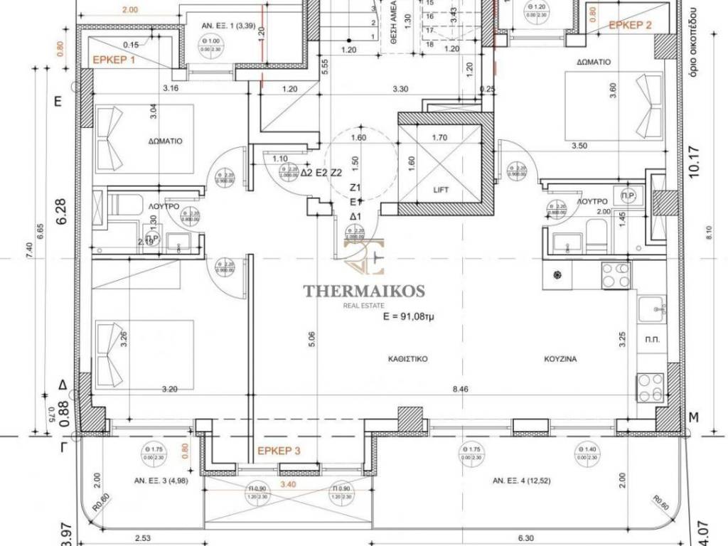 "Καλαμαριά - Κέντρο" Πωλείται νεόδμητο, οροφοδιαμέρισμα, πρόσοψης 127τ.μ. (91,08τ.μ. καθαρό). Πρόκειται για ένα πολυτελές, διαμπερές και φωτεινό ακίνητο. -Βρίσκεται στον 6ο όροφο της οικοδομής και διαθέτει ασανσέρ. -Το ακίνητο αποτελεί μια αξιόλογη επιλογή για οικογένειες και εργαζόμενους. -Πρόκειται για καινούργιο Project υπό κατασκευή ακίνητο. Αποτελείται από 3 υπνοδωμάτια με ντουλάπες, σαλοκουζίνα 1 μπάνιο και 1 wc. -Επιπλέον διαθέτει βεράντα -αποθήκη υπογείου και -Θέση στάθμευσης. Στα εσωτερικά του στοιχεία αξίζει να σημειωθούν η πόρτα ασφαλείας, η προεγκατάσταση του συναγερμού, η προεγκατάσταση του κλιματισμού. Διαθέτει κουφώματα αλουμινίου με διπλά τζάμια. Τα δάπεδα είναι από πλακάκια. Διαθέτει αυτόνομη ενδοδαπέδια θέρμανση με αντλία θερμότητας (ατομική). -Η ενεργειακή του κλάση είναι A+. -Ο προσανατολισμός είναι νοτιοδυτικός. Βρίσκεται κοντά σε στάση λεωφορείου, -σε απόσταση 500μ. από στάση μετρό. -ΓΕΝΙΚΕΣ ΠΛΗΡΟΦΟΡΙΕΣ Η Καλαμαριά είναι πυκνοδομημένη συνοικία της Θεσσαλονίκης στο νοτιοδυτικό τμήμα του Πολεοδομικού Συγκροτήματος Θεσσαλονίκης. Στην Καλαμαριά λειτουργούν 7 Γενικά Λύκεια, 2 Επαγγελματικά Λύκεια (Ημερήσιο και Εσπερινό), 10 Γυμνάσια, 18 δημοτικά σχολεία και 24 νηπιαγωγεία. Η Καλαμαριά συνδέεται με το κέντρο της Θεσσαλονίκης, από βόρεια μέσω των οδών Γεωργίου Παπανδρέου (Ανθέων) και Γρηγορίου Κυδωνιών ή μέσω Μαρίας Κάλλας και Θεμιστοκλή Σοφούλη και από νότια προς βόρεια μέσω των οδών Πόντου, Αιγαίου και της Λεωφόρου Βασιλίσσης Όλγας, ενώ η σύνδεση με την ανατολική πλευρά της πόλης επιτυγχάνεται μέσω της Λεωφόρου Εθνικής Αντίστασης. Η πρόσβαση στον κόμβο Κ12 της Περιφερειακής Οδού είναι εύκολη. Η περιοχή εξυπηρετείται από τις λεωφορειακές γραμμές 01Χ, 02Κ, 03Κ, 04, 05, 06, 07, 33, 39 του ΟΑΣΘ, καθώς και από τη μοναδική νυχτερινή γραμμή της πόλης 01Ν. Με βάση τα χαρακτηριστικά του μπορεί να χαρακτηριστεί ως μια πολύ καλή επενδυτική επιλογή. Τιμή πώλησης: 450.000€. Κωδικός ακινήτου: 11103 Για περισσότερα ακίνητα επισκεφθείτε την ιστοσελίδα μας http://www.thermaikosrealest.gr. Thermaikos Real Estate Κλεάνθους 39, Θεσσαλονίκη, Ελλάδα http://www.thermaikosrealest.gr info@thermaikosrealest.gr Τηλέφωνο: 2310900700 Κινητό: 6907219389, 6956139149 ΥΠΕΥΘΥΝΟΣ ΑΚΙΝΗΤΟΥ: ΣΑΛΒΑΡΗΣ ΓΙΩΡΓΟΣ Προσοχή! Για την υπόδειξη του ακινήτου είναι απαραίτητη η υπόδειξη της αστυνομικής ταυτότητας και του Α.Φ.Μ. σας σύμφωνα με τον Ν.4072/11-4-2012 ΦΕΚ 86 Α.