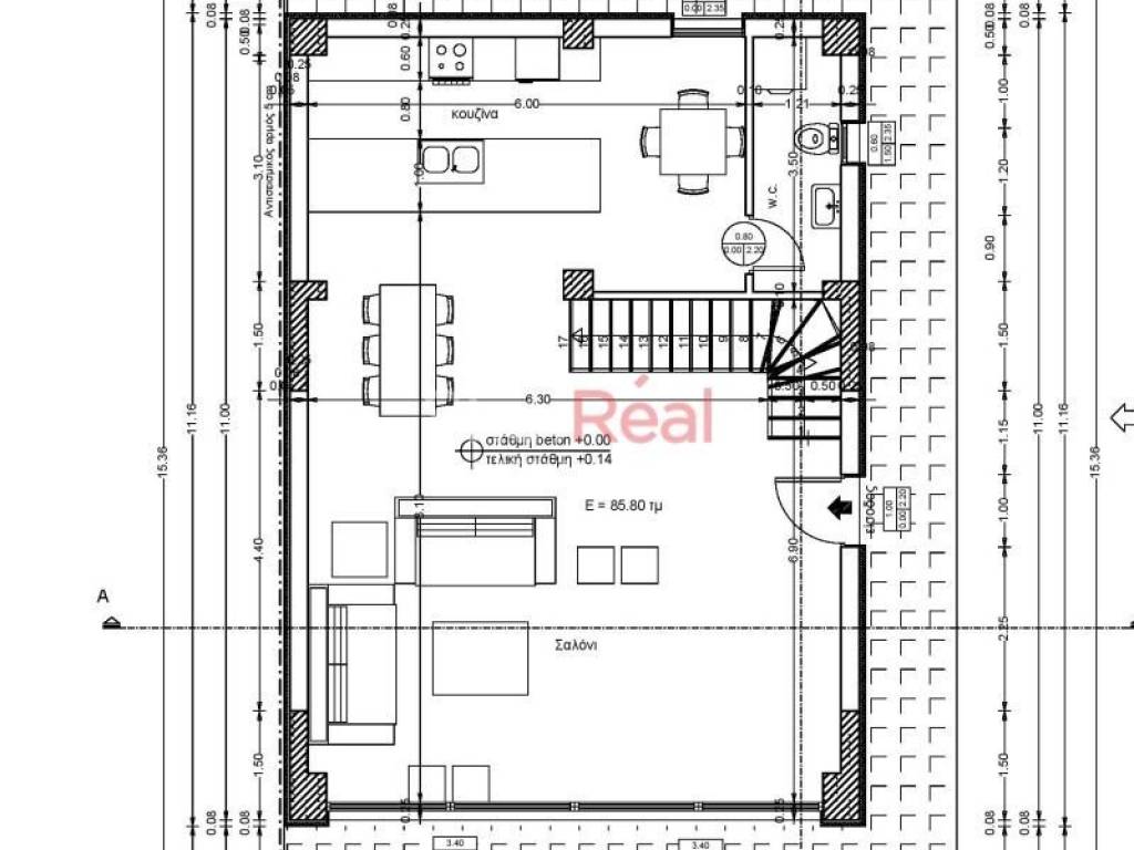 1) Ισόγειο ( 85,80 τ.μ.) : σαλοκουζίνα με τζάκι, Wc, laundry room.
