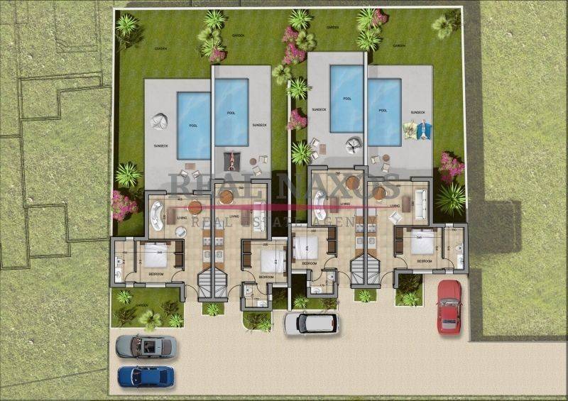 Κάθε κατοικία αναπτύσσεται σε δύο επίπεδα και περιλαμβάνει ενιαίο καθιστικό με ανοιχτή κουζίνα, δύο υπνοδωμάτια και δύο μπάνια. Στο ισόγειο βρίσκεται ένα υπνοδωμάτιο και ένα μπάνιο, ενώ στον επάνω όροφο υπάρχει δεύτερο υπνοδωμάτιο με ιδιωτικό μπάνιο, το οποίο οδηγεί σε ευρύχωρη βεράντα. Κάθε κατοικία διαθέτει επίσης ιδιωτική πισίνα.