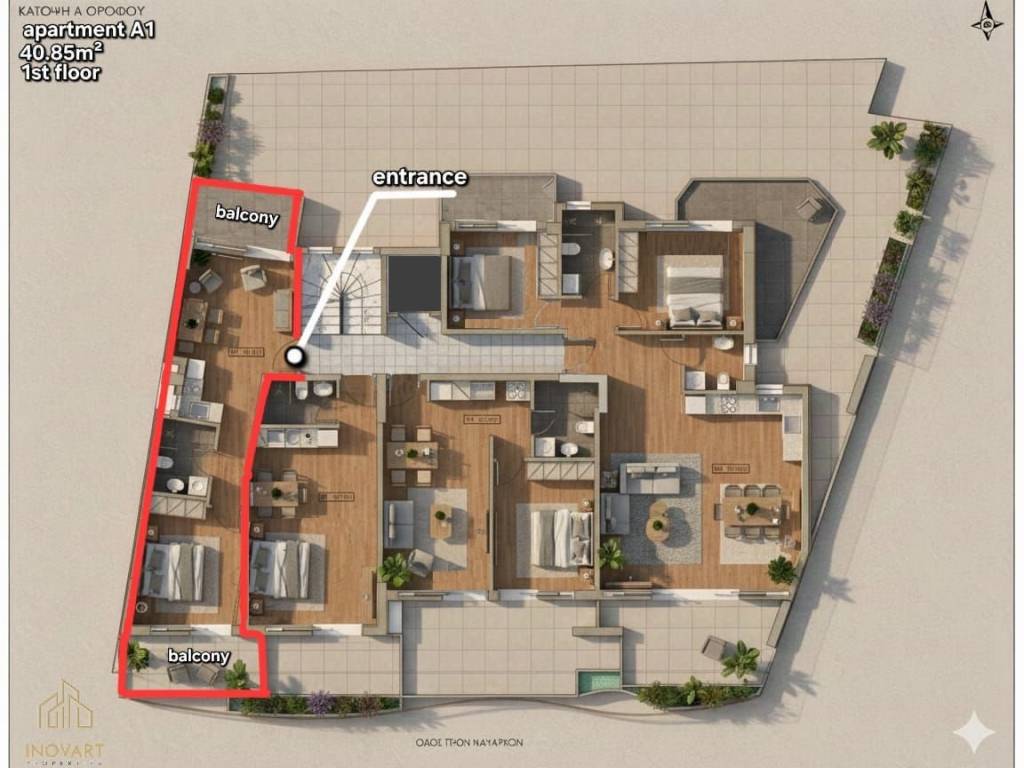 Πωλείται διαμέρισμα 1ου ορόφου 40,85 τ.μ. σε υπό ανέγερση οικοδομή, στην οδό Τριών Ναυάρχων, στην Καλαμάτα. Βρίσκεται σε ήσυχη τοποθεσία, με άμεση πρόσβαση στο κέντρο της πόλης. Η οικοδομή είναι σύγχρονης κατασκευής και υψηλής αισθητικής. Το διαμέρισμα είναι διαμπερές με προσανατολισμό Νότος–Βορράς, προσφέροντας άριστο φυσικό φωτισμό και φυσικό αερισμό. Αποτελείται από ενιαίο χώρο σαλοκουζίνας, ένα υπνοδωμάτιο και μπάνιο. Διαθέτει ευρύχωρα μπαλκόνια, κλιματισμό (A/C) και αποθήκη. Τιμή πώλησης: 130.000 € Παράδοση: 06/2028 For sale 1st floor apartment of 40.85 sq.m. in a building under construction, on Trion Navarchon Street, in Kalamata. It is located in a quiet location, with direct access to the city center. The building is of modern construction and high aesthetics. The apartment is bright with a South-North orientation, offering excellent natural lighting and natural ventilation. It consists of an open-plan living room-kitchen area, a bedroom and a bathroom. It has spacious balconies, air conditioning (A/C) and storage room. Selling price: €130,000 Delivery: 06/2028
