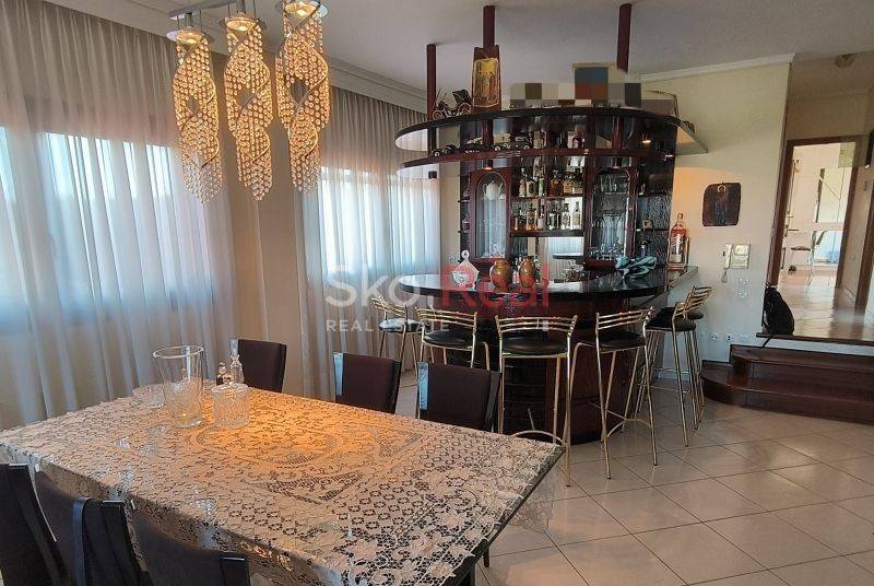 - Το κύριο σαλόνι, με κομψό μαρμάρινο τζάκι και λειτουργικό μπαρ, συνδέεται αρμονικά με τον χώρο τραπεζαρίας, δημιουργώντας ένα ιδανικό περιβάλλον φιλοξενίας.