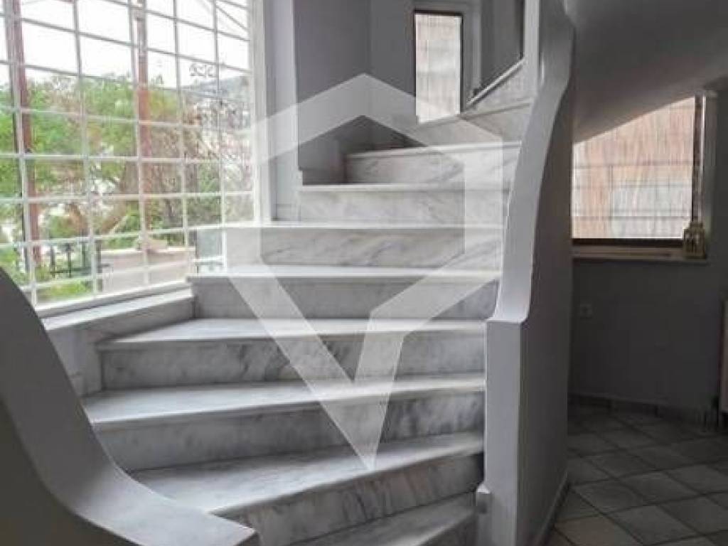 Μια καλαίσθητη μαρμάρινη σκάλα οδηγεί στον όροφο των 60 τ.μ., όπου βρίσκονται δύο υπνοδωμάτια και μπάνιο.