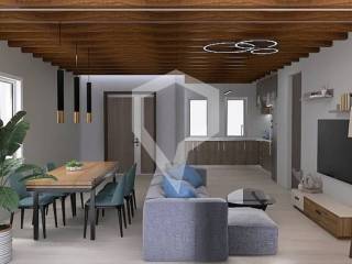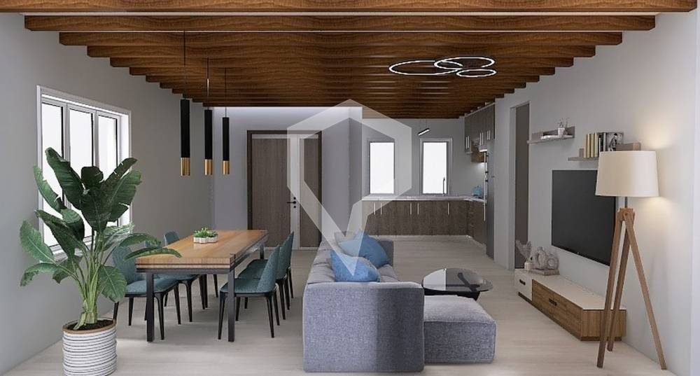 Η κατοικία των 100 τ.μ. αναπτύσσεται σε ενιαίο χώρο κουζίνας–τραπεζαρίας–καθιστικού και περιλαμβάνει τρία υπνοδωμάτια, εκ των οποίων το ένα διαθέτει ιδιωτικό μπάνιο, ένα επιπλέον λουτρό, καθώς και κλειστό χώρο στάθμευσης 23 τ.μ.