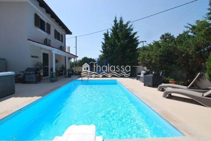 Ο χώρος αυτός επεκτείνεται φυσικά προς μια μεγάλη στεγασμένη βεράντα, ιδανική για υπαίθρια γεύματα, η οποία οδηγεί στον καταπράσινο κήπο και την ιδιωτική πισίνα διαστάσεων 7x3,5 μ.
