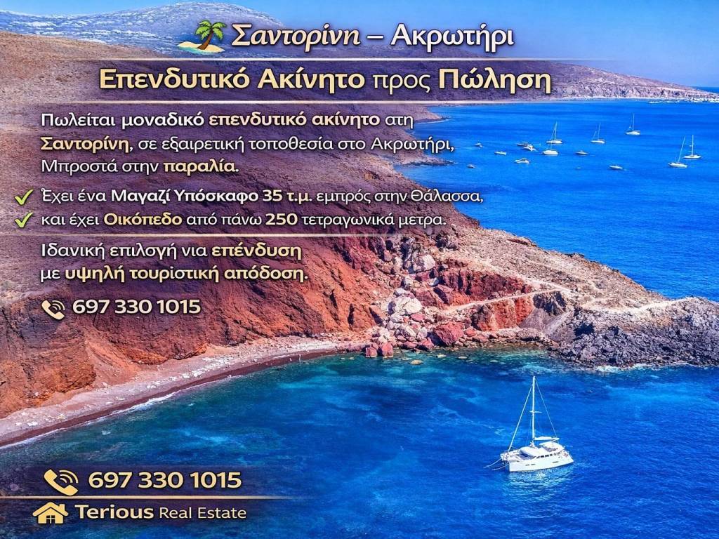 ️ Σαντορίνη – Ακρωτήρι Επενδυτικό Ακίνητο προς Πώληση Πωλείται μοναδικό επενδυτικό ακίνητο στη Σαντορίνη, σε εξαιρετική τοποθεσία στο Ακρωτήρι, Μπροστά στην παραλία. Έχει ένα Μαγαζί Υπόσκαφο 35 τ.μ. εμπρός στην Θάλασσα, και έχει Οικόπεδο από πάνω 250 τετραγωνικά μέτρα. Ιδανική επιλογή για επένδυση με υψηλή τουριστική απόδοση. 697 330 1015 Terious Real Estate