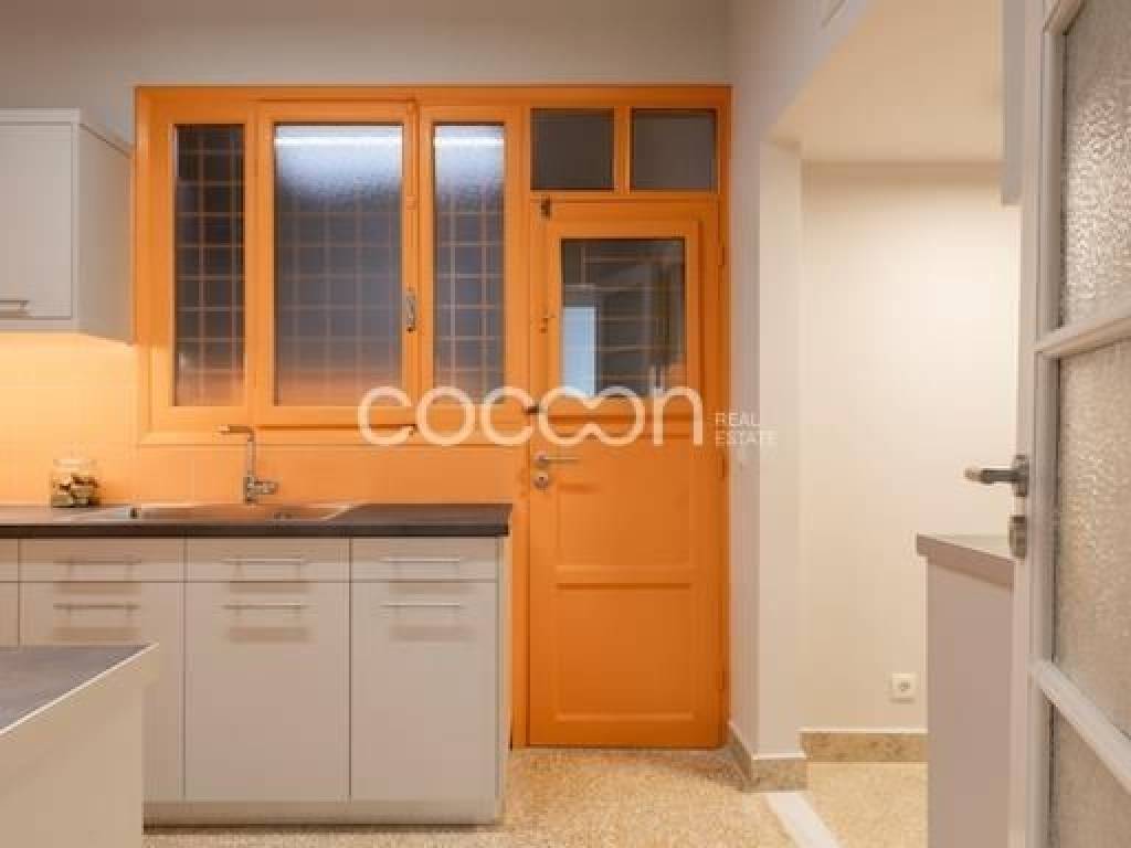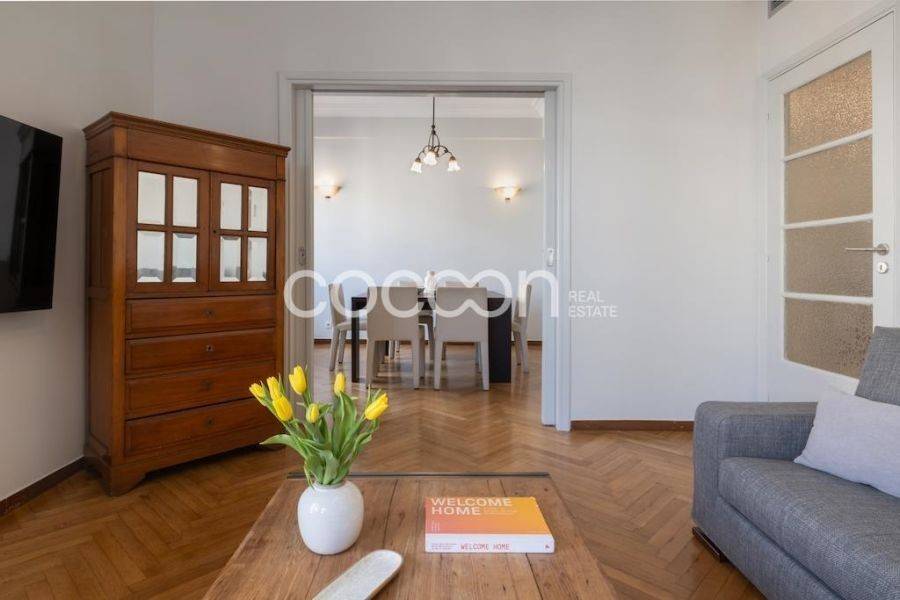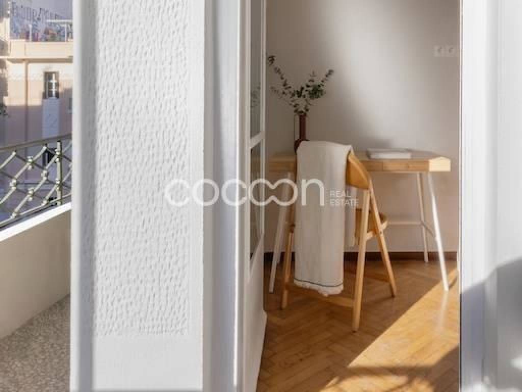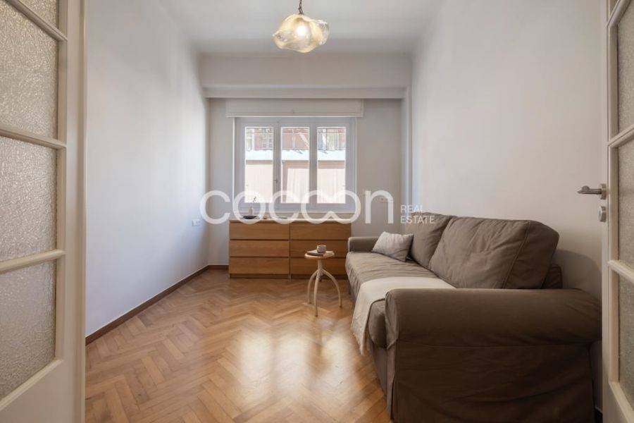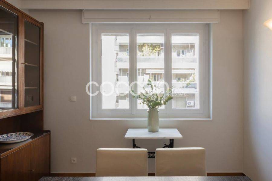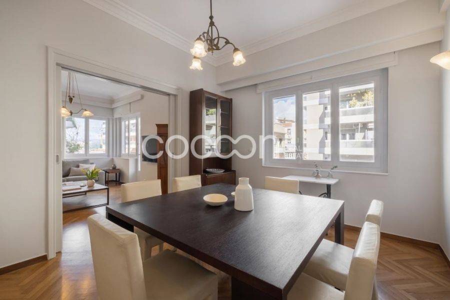 Επιπλωμένο ανακαινισμένο διαμέρισμα 117τ.μ. στον 3ο όροφο γωνιακής πολυκατοικία κατασκευ΄ής 1952 στα Εξάρχεια. Το διαμέρισμα ανακαινίστηκε το 2025 και αποτελείται από χωλ εισόδου, σαλόνι, τραπεζαρία (με ενδιάμεση πόρτα που ανοίγει και γίνεται ο χώρος ενιαίος), κουζίνα, 2 υπνοδωμάτια και γραφείο με καναπέ-κρεβάτι που μπορεί να χρησιμοποιηθεί και ως ξενώνας, 2 μπάνια. Περισσότερα χαρακτηριστικά: - φωτεινό - ξύλινα παράθυρα με διπλά τζάμια - θερμοπρόσoψη - ηλεκτρικά ρολά - ατομική θέρμανση/ψύξη με αντλία θερμότητας - ηλιακός - εξοπλισμένη κουζίνα