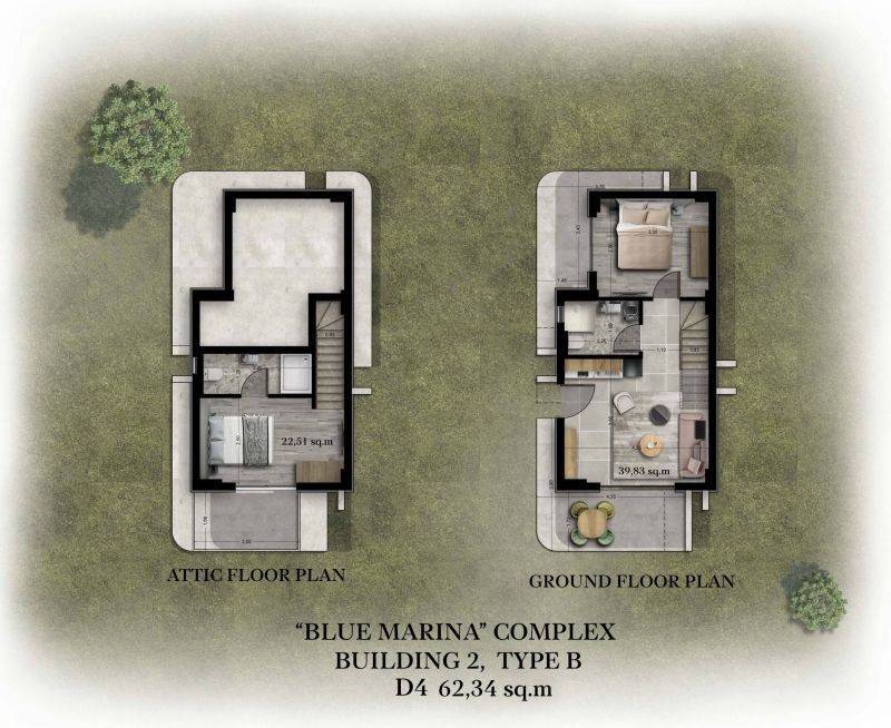 • 5 Διώροφες Μεζονέτες με σοφίτα 62,34 τ.μ., που αποτελούνται από σαλοκουζίνα, δύο υπνοδωμάτια και δύο μπάνια.