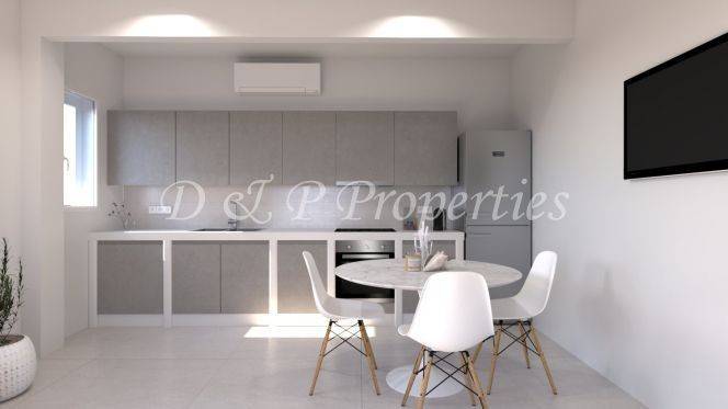 Θερμοπρόσοψη, θερμοδιακοπτόμενα κουφώματα, κτιστή κουζίνα και λουτρό με πατητή τσιμετοκονία, εντοιχισμένες συσκευές (ΤΕΚΑ) προεγκατάσταση κλιματισμού,