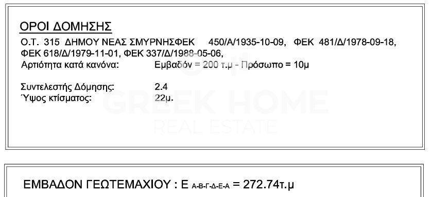 ΝΕΑ ΣΜΥΡΝΗ - Οικόπεδο 273τμ, ΣΔ 2.4, ΣΚ 60%, με κτίσμα (χρήζει ανακαίνισης), πρόσοψη 11μ, βάθος 25μ, αμιγούς κατοικίας, επίπεδο, πρόσοψης, γενικής χρήσης, εντός σχεδίου, εντός ζώνης, οικιστική ζώνη, άρτιο, οικοδομήσιμο, αντιπαροχή δεκτή, φως, νερό, αρδεύσιμο, πρόσβαση: άσφαλτο, χαμηλή όχληση, τιμή συζητήσιμη, ευκαιρία. Μόνο Αντιπαροχή. Τιμή €40 (κωδ. 152854) 2110168800 ΑΛΙΜΟΣ GREEKHOME REAL ESTATE