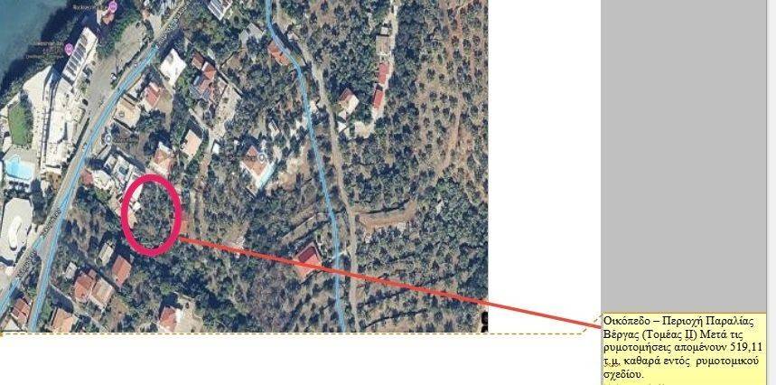 Πωλείται γεωτεμάχιο συνολικής επιφάνειας 767,76 τ.μ. στην περιοχή Βέργας. Από το σύνολο. 694,46 τ.μ. εντός ρυμοτομικού σχεδίου . 73,30 τ.μ. εκτός σχεδίου. Με την ολοκλήρωση της Πράξης Εφαρμογής, το καθαρό εναπομένον οικόπεδο διαμορφώνεται σε , 519,11 τ.μ. εντός ρυμοτομικού σχεδίου.