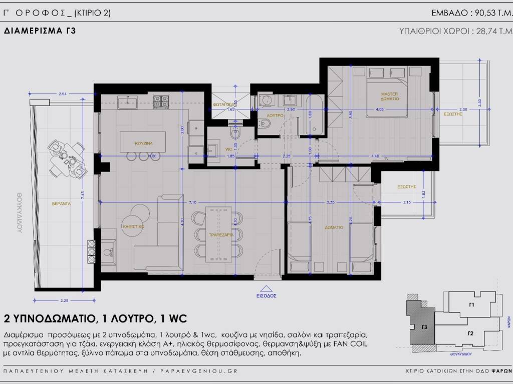 Τετραώροφη πολυκατοικία επί πιλοτής στη συμβολή των οδών Ψαρών και Θουκυδίδου στη Καλαμάτα. Περιγραφή οικοπέδου: Μοναδικό οικόπεδο τριών όψεων με κύριες όψεις Νότο και Ανατολή που βρίσκεται απέναντι από το πάρκο του ΟΣΕ με ανεμπόδιστη θέα και δίπλα στο λιμάνι της πόλης. Η κεντρική πλατεία της Καλαμάτας βρίσκεται σε απόσταση μικρότερη του 1 χλμ. Περιγραφή κτιρίου: Τετραώροφη πολυκατοικία με θέσεις στάθμευσης στην πιλοτή (και στεγασμένες θέσεις στον ακάλυπτο χώρο του οικοπέδου) και υπόγειο με αποθήκες που αντιστοιχούν στα διαμερίσματα. Ειδικά τεχνικά χαρακτηριστικά • Φέρων οργανισμός από οπλισμένο σκυρόδεμα ποιότητας C 30-37 και σιδηρό οπλισμό Β500C. • Κτίριο ενεργειακού σχεδιασμού της υψηλότερης ενεργειακής κλάσης Α+. Επένδυση όψεων με θερμοπρόσοψη, αντλίες θερμότητας για ψύξη/θέρμανση, ενεργειακά κουφώματα, ηλιακοί συλλέκτες για ΖΝΧ και φωτοβολταϊκά συστήματα για ενεργειακό συμψηφισμό (σε κάποια από τα μεγάλα διαμερίσματα). • Υψηλή στεγανοποίηση σε όλους τους εξωτερικούς χώρους. • Ηχομόνωση τόσο μεταξύ των ιδιοκτησιών όσο και μεταξύ των ορόφων. • Ανελκυστήρας(MRL) με στάση σε όλους τους ορόφους και στο υπόγειο. Διαμπερές τριάρι διαμέρισμα Γ' ορόφου (δύο υπνοδωματίων) επιφανείας 91 τ.μ. που συνοδεύεται από μία(1) στεγασμένη θέση στάθμευσης στη πιλοτή και μία(1) αποθήκη (18 τ.μ.) στο υπόγειο. • Αυτόνομο σύστημα θέρμανσης – ψύξης με κεντρική αντλία θερμότητας και fan coil. • Ηλιακός συλλέκτης. • Κεντρική είσοδος διαμερίσματος με πόρτα ασφαλείας. • Ξύλινα πατώματα στα Υ/Δ. • Πλήρης ηλεκτρολογική εγκατάσταση τριφασικής παροχής. • Ηλεκτρολογική εγκατάσταση για τοποθέτηση συναγερμού. • Υποδομή για την εγκατάσταση σταθμού φόρτισης ηλεκτρικών αυτοκινήτων στη θέση στάθμευσης. • Εφαρμογές SMART HOME για έλεγχο των κεντρικών ηλεκτρικών συσκευών του διαμερίσματος(κουζίνα, αντλία θερμότητας, θερμοσίφωνο). Η κατασκευή θα ξεκινήσει το Μάρτιο του 2026 και η παράδοση προβλέπεται αρχές του 2028. Στο κτίριο υπάρχουν διαθέσιμα διαμερίσματα δυάρια, τριάρια και τεσσάρια. Α' όροφος: 95 τ.μ. , 56 τ.μ., 91 τ.μ. Β' όροφος: 64 τ.μ. , 56 τ.μ., 91 τ.μ. Γ΄ όροφος: 121 τ.μ. , 91 τ.μ. Δ' όροφος: 133 τ.μ. , 91 τ.μ. Τηλ : 6942768428, 6945899958, 2721026950