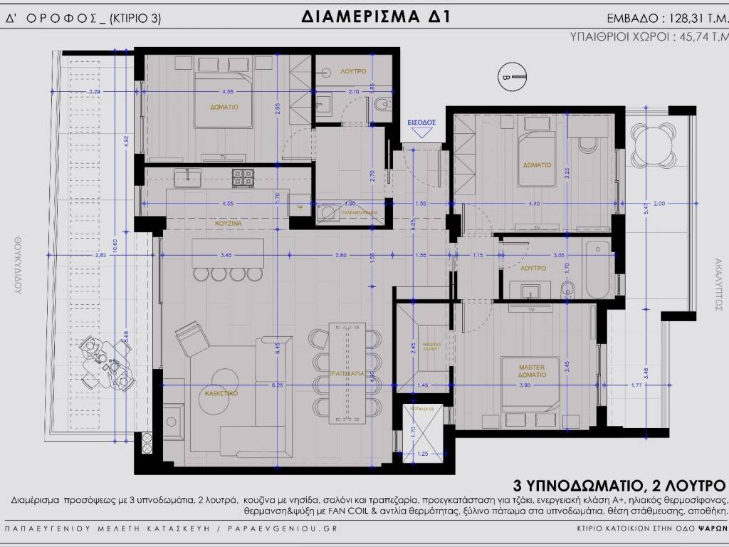 Τετραώροφη πολυκατοικία επί πιλοτής στη συμβολή των οδών Ψαρών και Θουκυδίδου στη Καλαμάτα. Περιγραφή οικοπέδου: Μοναδικό οικόπεδο τριών όψεων με κύριες όψεις Νότο και Ανατολή που βρίσκεται απέναντι από το πάρκο του ΟΣΕ με ανεμπόδιστη θέα και δίπλα στο λιμάνι της πόλης. Η κεντρική πλατεία της Καλαμάτας βρίσκεται σε απόσταση μικρότερη του 1 χλμ. Περιγραφή κτιρίου: Τετραώροφη πολυκατοικία με θέσεις στάθμευσης στην πιλοτή (και στεγασμένες θέσεις στον ακάλυπτο χώρο του οικοπέδου) και υπόγειο με αποθήκες που αντιστοιχούν στα διαμερίσματα. Ειδικά τεχνικά χαρακτηριστικά • Φέρων οργανισμός από οπλισμένο σκυρόδεμα ποιότητας C 30-37 και σιδηρό οπλισμό Β500C. • Κτίριο ενεργειακού σχεδιασμού της υψηλότερης ενεργειακής κλάσης Α+. Επένδυση όψεων με θερμοπρόσοψη, αντλίες θερμότητας για ψύξη/θέρμανση, ενεργειακά κουφώματα, ηλιακοί συλλέκτες για ΖΝΧ και φωτοβολταϊκά συστήματα για ενεργειακό συμψηφισμό (σε κάποια από τα μεγάλα διαμερίσματα). • Υψηλή στεγανοποίηση σε όλους τους εξωτερικούς χώρους. • Ηχομόνωση τόσο μεταξύ των ιδιοκτησιών όσο και μεταξύ των ορόφων. • Ανελκυστήρας(MRL) με στάση σε όλους τους ορόφους και στο υπόγειο. Διαμπερές τεσσάρι διαμέρισμα Δ' ορόφου (τριών υπνοδωματίων) επιφανείας 128,31 τ.μ. που συνοδεύεται από μία(1) στεγασμένη θέση στάθμευσης στη πιλοτή και μία(1) αποθήκη (24 τ.μ.) στο υπόγειο. • Αυτόνομο σύστημα θέρμανσης – ψύξης με κεντρική αντλία θερμότητας και fan coil. • Ιδιόκτητο φωτοβολταϊκό σύστημα 5kwp για ενεργειακό συμψηφισμό του διαμερίσματος(Net billing - Net metering) • Ηλιακός συλλέκτης. • Κεντρική είσοδος διαμερίσματος με πόρτα ασφαλείας. • Ξύλινα πατώματα στα Υ/Δ. • Πλήρης ηλεκτρολογική εγκατάσταση τριφασικής παροχής. • Ηλεκτρολογική εγκατάσταση για τοποθέτηση συναγερμού. • Υποδομή για την εγκατάσταση σταθμού φόρτισης ηλεκτρικών αυτοκινήτων στη θέση στάθμευσης. • Εφαρμογές SMART HOME για έλεγχο των κεντρικών ηλεκτρικών συσκευών του διαμερίσματος(κουζίνα, αντλία θερμότητας, θερμοσίφωνο). Η κατασκευή θα ξεκινήσει το Μάρτιο του 2026 και η παράδοση προβλέπεται στα τέλη του 2028. Στο κτίριο υπάρχουν διαθέσιμα διαμερίσματα δυάρια, τριάρια και τεσσάρια. Α' όροφος: 53τ.μ., 92 τ.μ. Β' όροφος: 53 τ.μ., 54 τ.μ., 92 τ.μ. Γ΄ όροφος: 128 τ.μ. , 113 τ.μ. Δ' όροφος: 128 τ.μ. , 150 τ.μ. Τηλ : 6942768428, 6945899958, 2721026950
