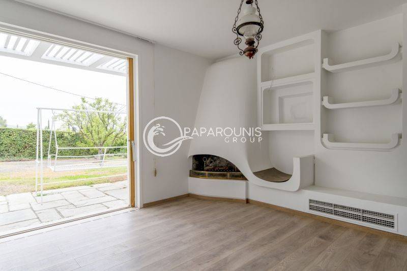 Όπως προχωράμε στο σαλόνι ένας τοίχος μας δημιουργεί δημιουργεί έναν ακόμη χώρο χαλάρωσης σαν 2ο καθιστικό , με ένα τζάκι στην γωνία και άνετο χώρο με θέα επίσης στον υπέροχο κήπο .