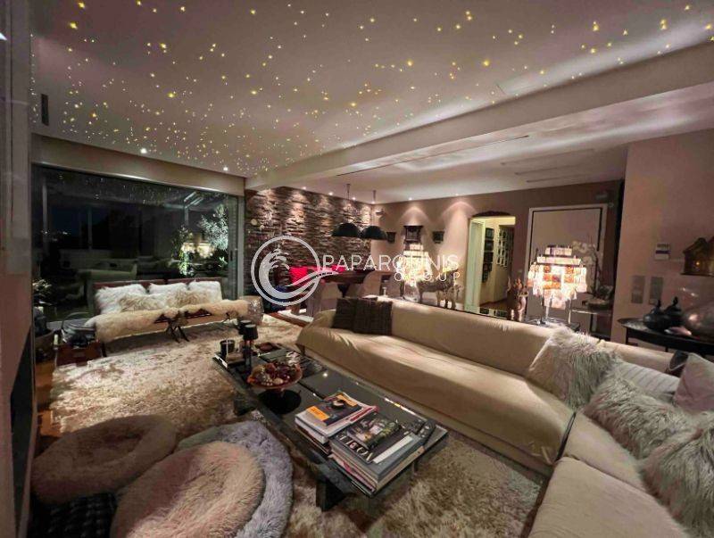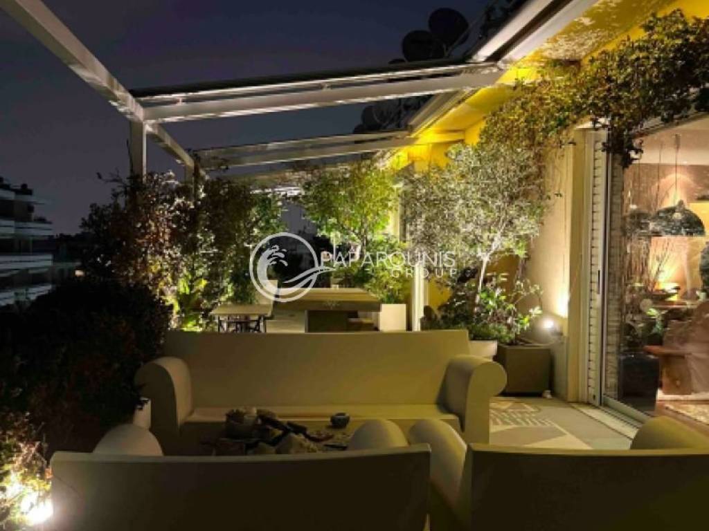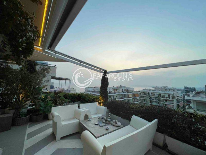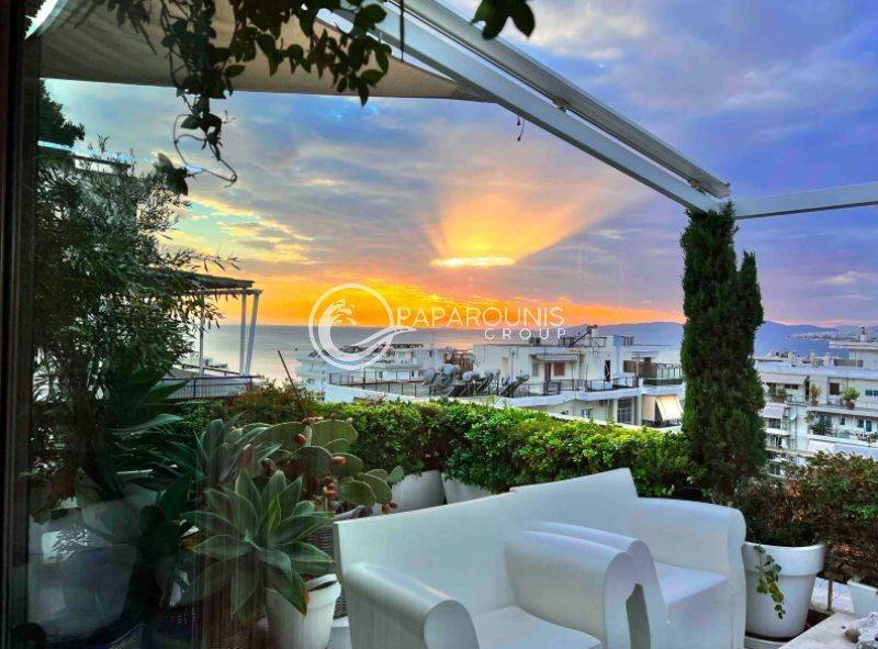 Διαμπερές και λουσμένο στο φως καθ’ όλη τη διάρκεια της ημέρας, αγκαλιάζεται από μια εντυπωσιακή περιμετρική βεράντα 250 τ.μ., προσφέροντας πανοραμική, απεριόριστη θέα στη θάλασσα και την Ακρόπολη ,θέα που απολαμβάνετε ακόμη και από το εσωτερικό του σπιτιού.