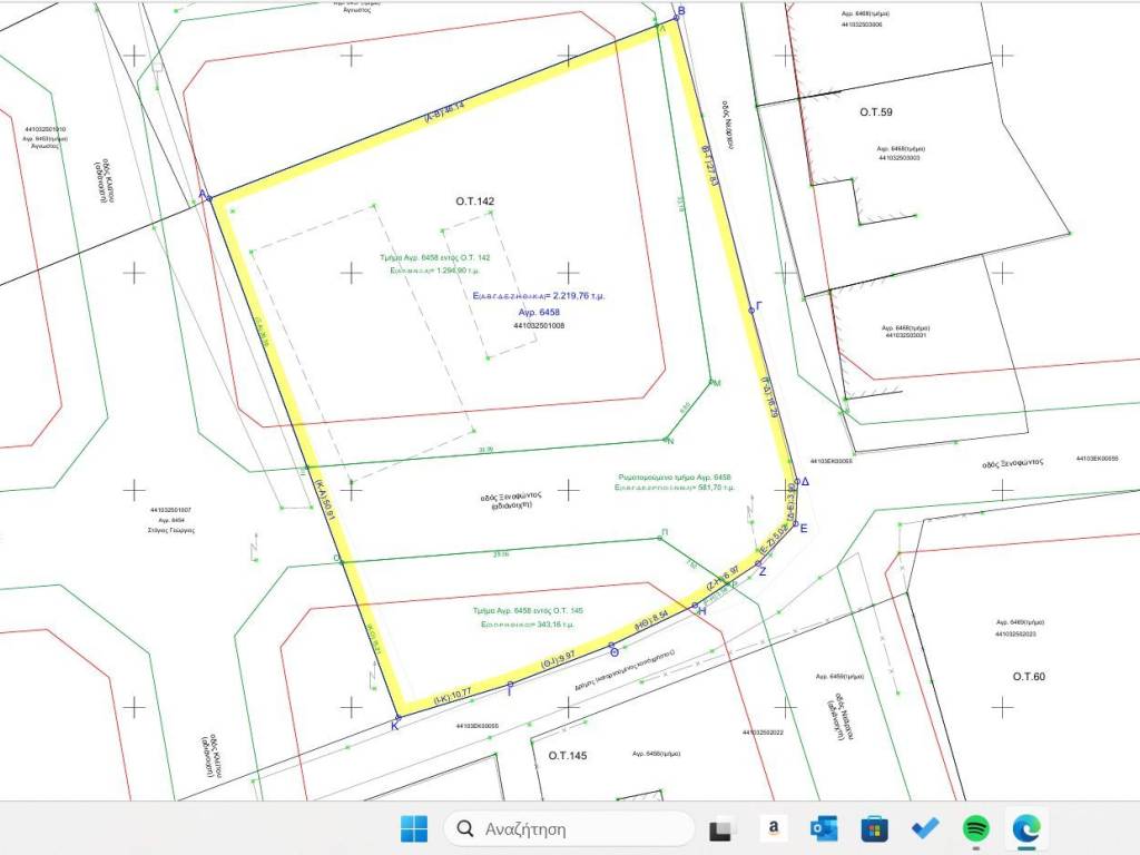 Το αγροτεμάχιο με αρ. 6458 της διανομής του 1935 κείται εντός του σχεδίου πόλεως Νιγρίτας. Το εμβαδόν του αγροτεμαχίου είναι 2.220 τ.μ. Από αυτά ρυμοτομούνται τα 582 τ.μ. και απομένουν δύο οικόπεδα άρτια κατά το εμβαδόν αλλά όχι οικοδομήσιμα πριν από την τακτοποίησή τους. Στο Ο.Τ. 142 υπάρχουν 1295 τ.μ. και στο Ο.Τ.145 υπάρχουν 343 τ.μ., δηλαδή το σύνολο της έκτασης των δύο οικοπέδων είναι 1638 τ.μ. Χρειάζεται δηλαδή να γίνει μία διαδικασία στην πολεοδομία για να μπορούν να οικοδομηθούν. (Πράξη Τακτοποίησης).