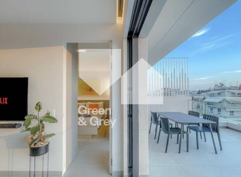 Πρόκειται για ένα διαμέρισμα 8ου ορόφου με δύο υπνοδωμάτια (70τμ ) με μπαλκόνι 30 τμ το οποίο διαθέτει ως παρακολούθημα ένα δώμα αποκλειστικής χρήσης στην ταράτσα (20 τμ.) που έχει διαμορφωθεί ως studio.