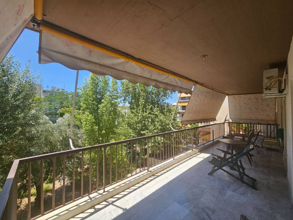 Διαμέρισμα 2ου ορόφου, ευάερο, ευήλιο, με μεγάλη βεράντα. Μπαίνοντας, ένανς μεγάλος ενιαίος χώρος, που περιλαμβάνει καθιστικό και κουζίνα με πάσο ανοιχτού τύπου. Με πρόσβαση στη μεγάλη βεράντα. Η βεράντα είναι γωνιακή με θέα προς τον μεγάλο καταπράσινο κήπο, στο πίσω μέρος του οικοπέδου. Αριστερά διάδρομος, που οδηγεί στους υπόλοιπους χώρους, δηλαδή, το ευρύχωρο μπάνιο με ντουζιέρα και πατάρι από πάνω, και τα τρία δωμάτια σε σειρά, από τα οποία, το γωνιακό και το τελευταίο δίπλα από το μπάνιο με εντοιχισμένες ντουλάπες, όλα με πρόσβαση στη βεράντα, το γωνιακό και με έξτρα παράθυρο. Υπάρχουν εναλλακτικές λύσεις, για τη δημιουργία μεγαλύτερου, μάστερ υπνοδωματίου, ανάλογα με τις ανάγκες. Τα κουφώματα είναι παλιά αλουμινίου, τα δάπεδα είναι, μάρμαρο σε όλους τους χώρους, της βεράντας συμπεριλαμβανομένης, ξύλινα στα υπνοδωμάτια. Η θέρμανση είναι κεντρική φυσικού αερίου, με δυνατότητα αυτονομίας, είτε με φυσικό αέριο είτε με αντλία θερμότητας, για την οποία υπάρχει προέγκριση. Έχει περαστεί οπτική ίνα στην πολυκατοικία. Υπάρχει αποθήκη στο υπόγειο, όπως επίσης και θέση πάρκινγκ στο πίσω μέρος, δίπλα στον κήπο. Η τοποθεσία είναι εξαιρετική, πολύ ήσυχη, κέντρο απόκεντρο, σε απόσταση 2' από την κεντρική πλατεία και από τον κεντρικότερο δρόμο του Χαλανδρίου. Στην περιοχή υπάρχουν, δίπλα ακριβώς σχολείο, αγορά, ουπερμάρκετ, κάθε είδους εμπορικά καταστήματα, τράπεζες, καφέ, εστιατόρια κ.λ.π. Περισσότερα ακίνητα στο www.mestate.gr