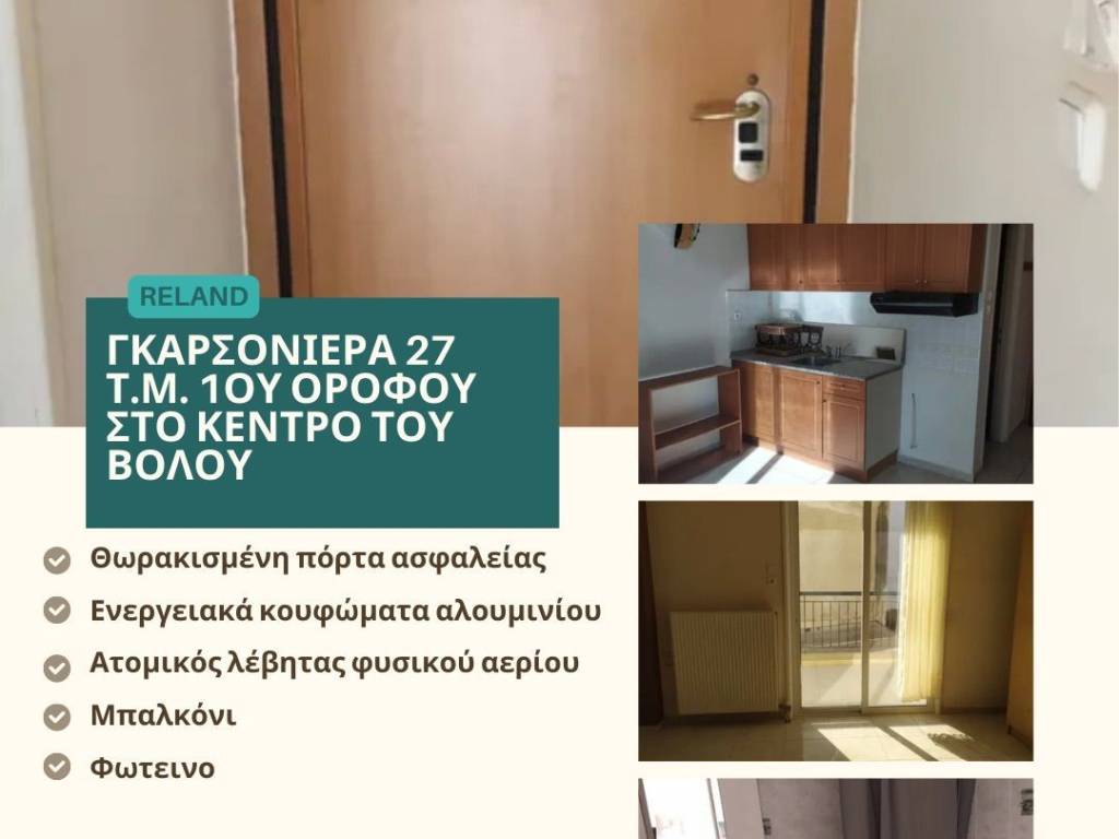 RELAND Ενοικιάζεται γκαρσονιερα 27 τ.μ. 1ου ορόφου στο κέντρο του Βολου. Αποτελείται από ενιαίο χώρο κουζίνα - υπνοδωμάτιο, μπάνιο και μπαλκόνι. ΧΑΡΑΚΤΗΡΙΣΤΙΚΑ ΑΚΙΝΗΤΟΥ : • Θωρακισμένη πόρτα ασφαλείας • Ενεργειακά κουφώματα αλουμινίου • Ατομικός λέβητας φυσικού αερίου • Έτος κατασκευής 2005 Ιδανική επιλογή για φοιτητή και εργαζόμενο. ΑΜΕΣΑ ΔΙΑΘΕΣΙΜΟ Για περισσότερες πληροφορίες η προγραμματισμό ραντεβού επικοινωνήστε στο : 6970080280