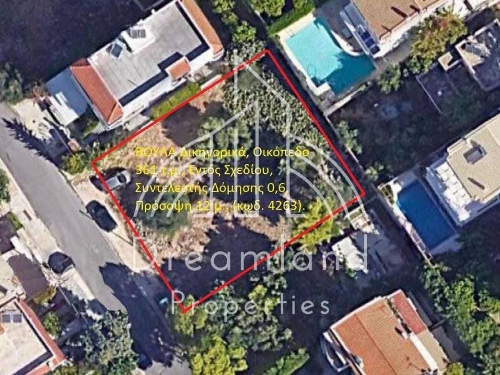 ΒΟΥΛΑ Δικηγορικά, Οικόπεδο 361 τ.μ., Εντός Σχεδίου, Συντελεστής Δόμησης 0,6, Πρόσοψη 12 μ., Τιμή 600.000 Ευρώ (κωδ. 4263).