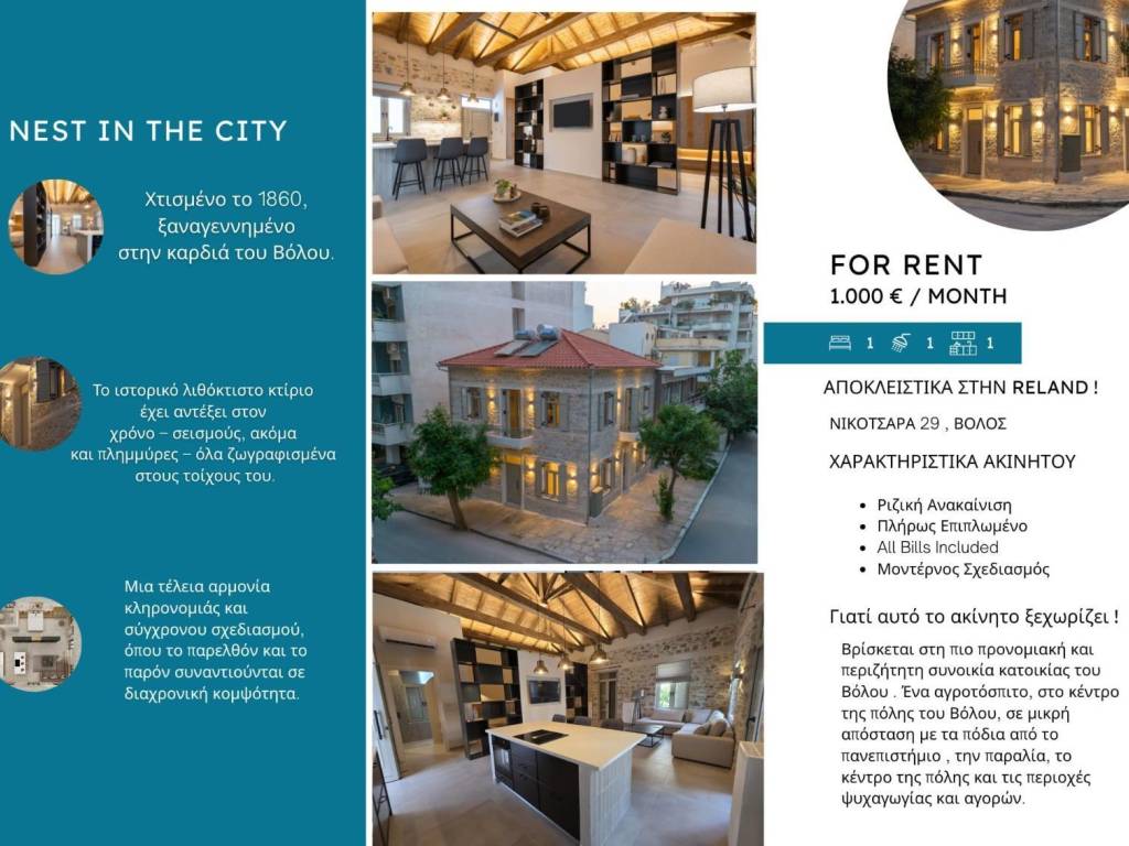 ✨ Luxury πέτρινο διαμέρισμα στο κέντρο του Βόλου Προς ενοικίαση μοναδικό διαμέρισμα 70 τ.μ. στον 1ο όροφο ιστορικής πέτρινης κατοικίας του 1860, πλήρως ανακαινισμένο με σύγχρονο σχεδιασμό και υψηλή αισθητική. Το ακίνητο διαθέτει ενιαία σαλονοκουζίνα με μοντέρνα διαρρύθμιση και υπνοδωμάτιο που χωρίζεται με διακοσμητικό luxury τοίχο, δημιουργώντας έναν κομψό και λειτουργικό χώρο. Πλήρως επιπλωμένο ✨ Ριζικά ανακαινισμένο Εξαιρετική τοποθεσία στο κέντρο του Βόλου Σύγχρονος σχεδιασμός & ποιοτικά υλικά Ιδανικό για όσους αναζητούν ένα μοναδικό και πολυτελές σπίτι με χαρακτήρα. 1.000€ / μήνα Το συγκεκριμένο διαμέρισμα διατίθεται και ως προς πώληση, όπως και τα υπόλοιπα στο κτίσμα. Αποκλειστικά στην RELAND Real Estate Για περισσότερες πληροφορίες ή για προγραμματισμό επίσκεψης επικοινωνήστε με τη RELAND Real Estate 697 008 0280