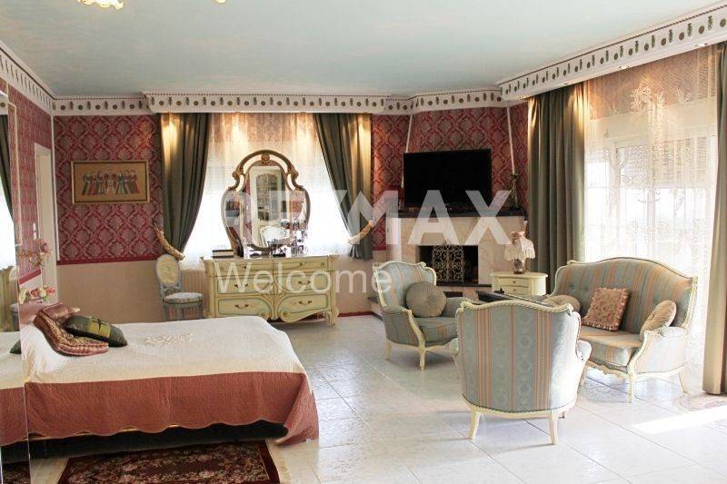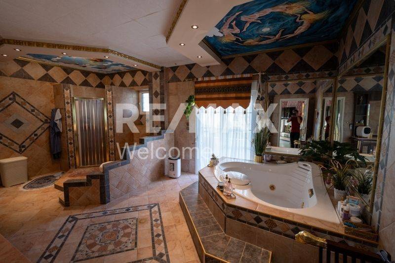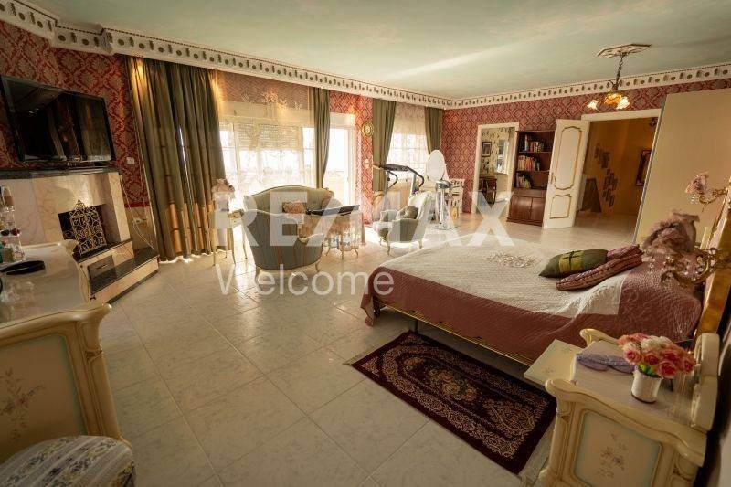 Ο επάνω όροφος φιλοξενεί τους πιο ιδιωτικούς χώρους της κατοικίας. Εκεί βρίσκεται μια εντυπωσιακή master κρεβατοκάμαρα 46 τ.μ. με τζάκι, καθώς και ένα εξαιρετικά μεγάλο μπάνιο 26 τ.μ. εξοπλισμένο με jacuzzi και ξεχωριστή ντουζιέρα. Στο ίδιο επίπεδο υπάρχει ένας ξεχωριστός χώρος διαμορφωμένος ως dressing room με μεγάλες ντουλάπες περιμετρικά, καθώς και ένα μικρό δωμάτιο που χρησιμοποιείται ως laundry room για πλυντήριο και στεγνωτήριο. Επιπλέον υπάρχει ακόμη ένα master bedroom με το δικό του μπάνιο.