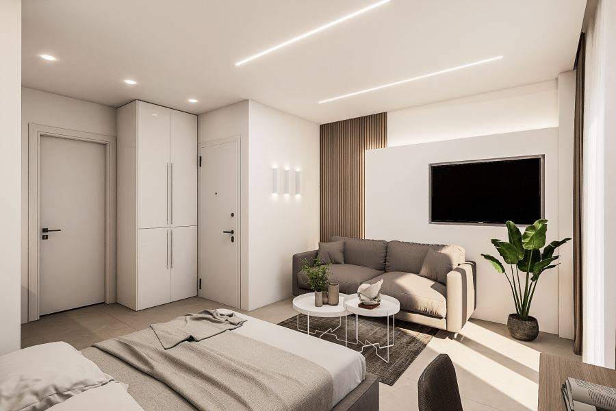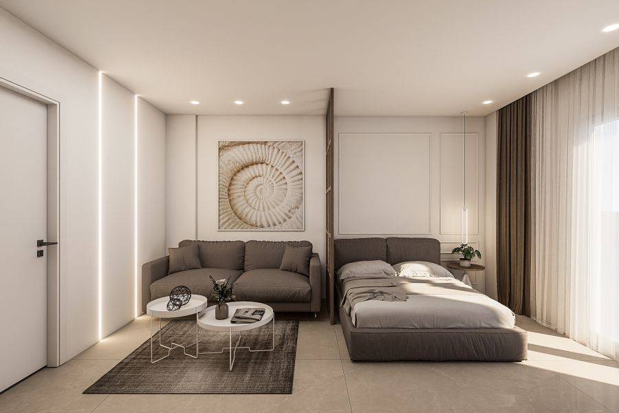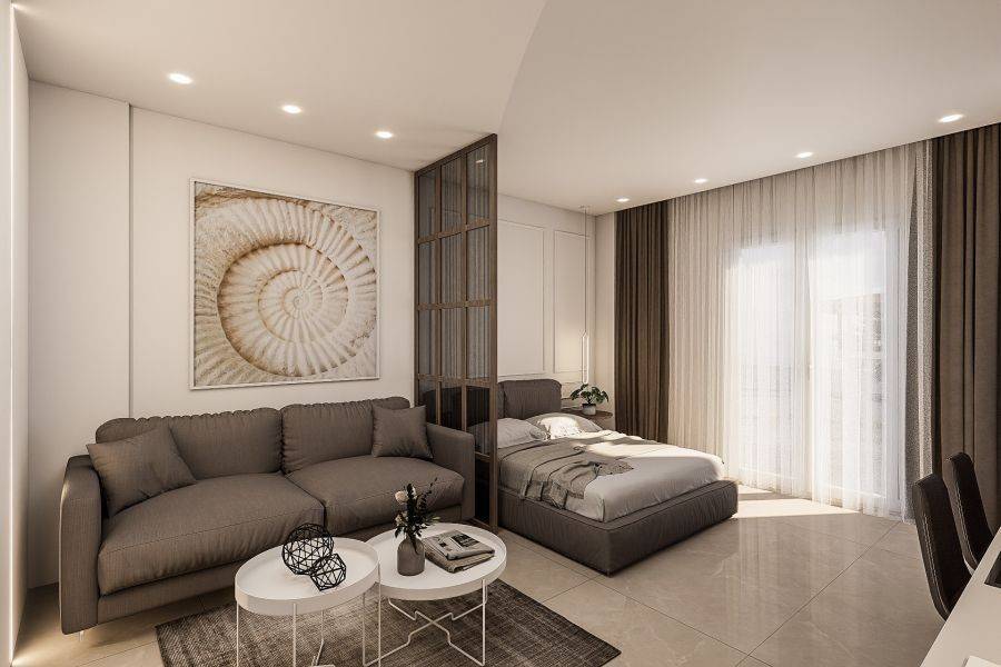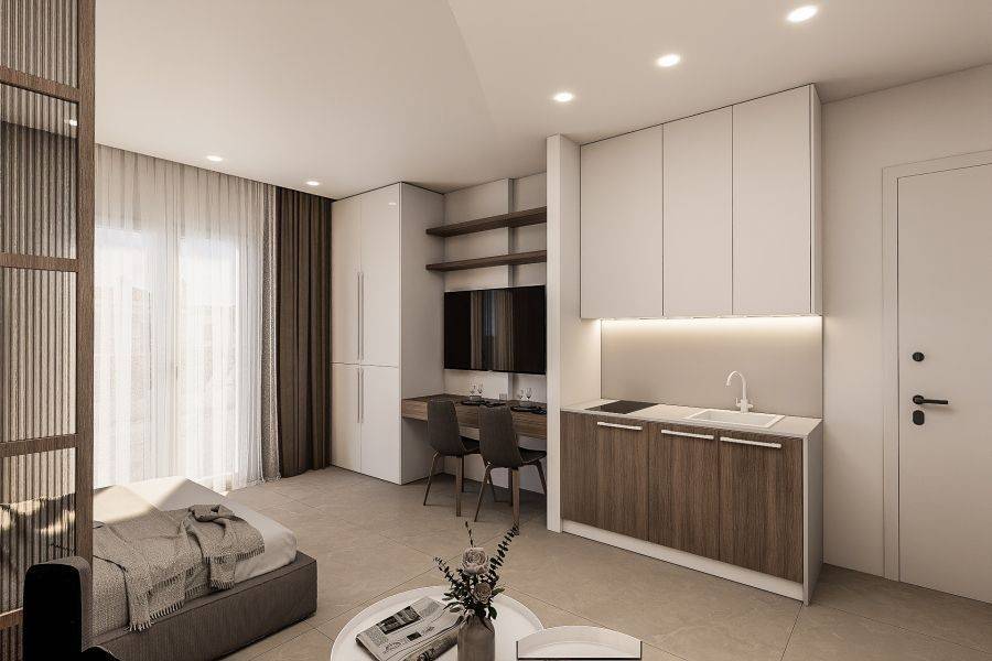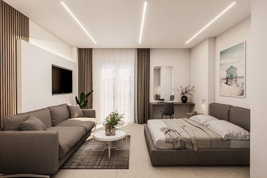 Property code: 218401 - Halkidiki - Pefkohori 30 meters from the beach FOR RENT a completely renovated and furnished studio 30 sq.m. either by the season or per month. Located on the 1st floor. It’s equipped with smart TV with satellite channels, refrigerator, washing machine, microwave, coffee maker and ceramic hobs, A/c inverter 12000Btu. It has a comfortable balcony with a side view of the sea. The sofa is convertible and becomes a double bed with the ability to accommodate up to 4 people. The price includes Internet connection (Starlink) and 24h hot water with solar water heater-boiler.