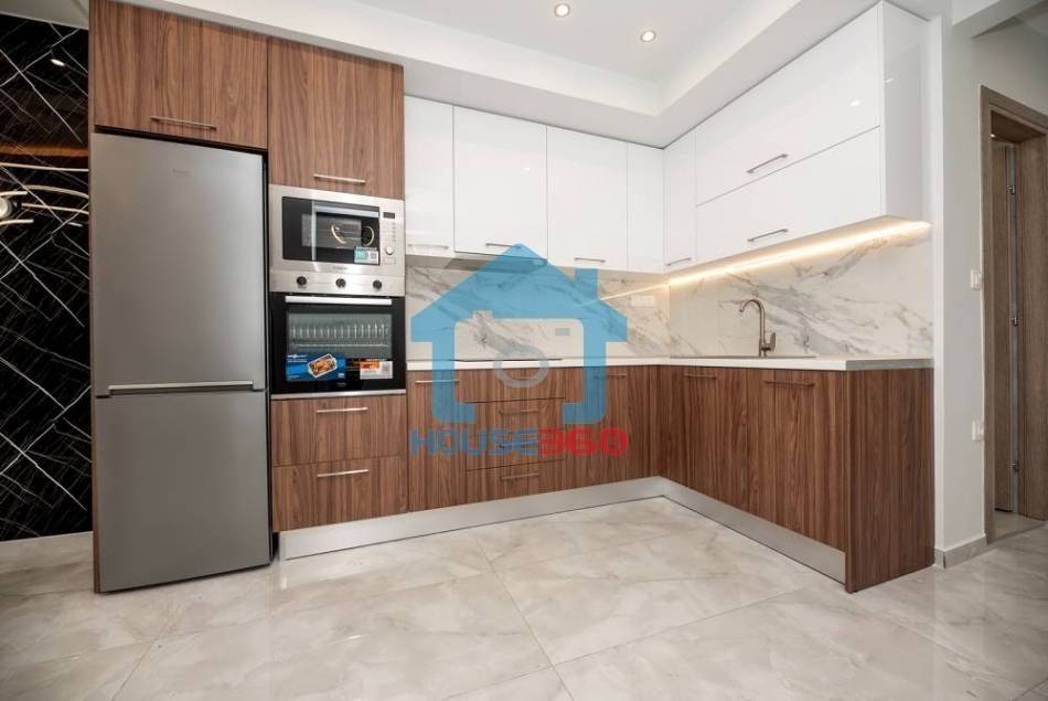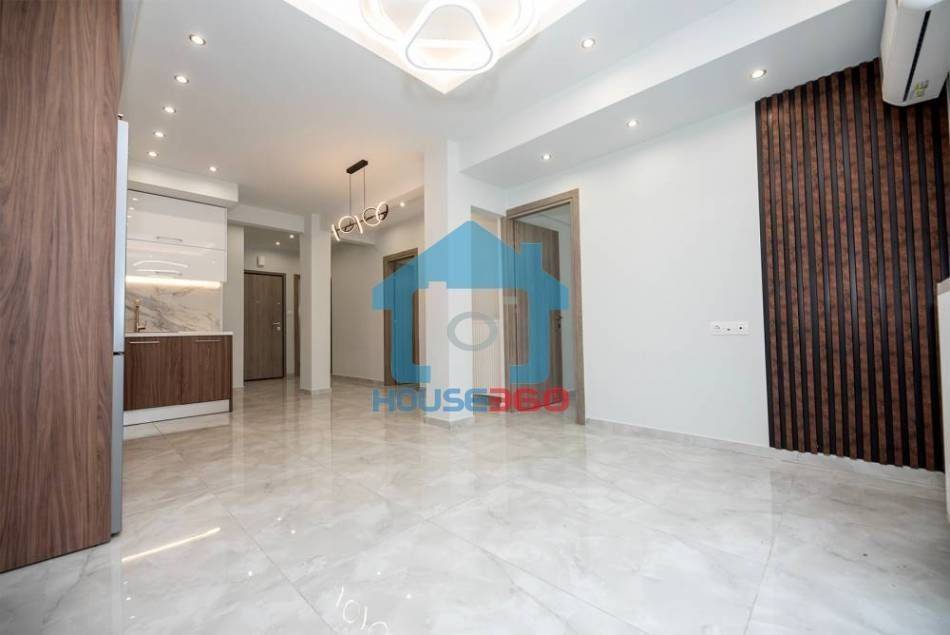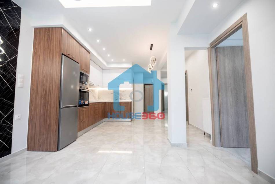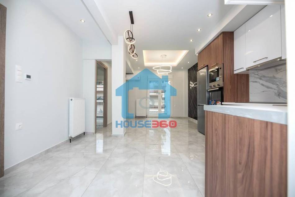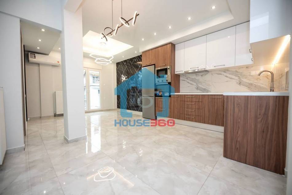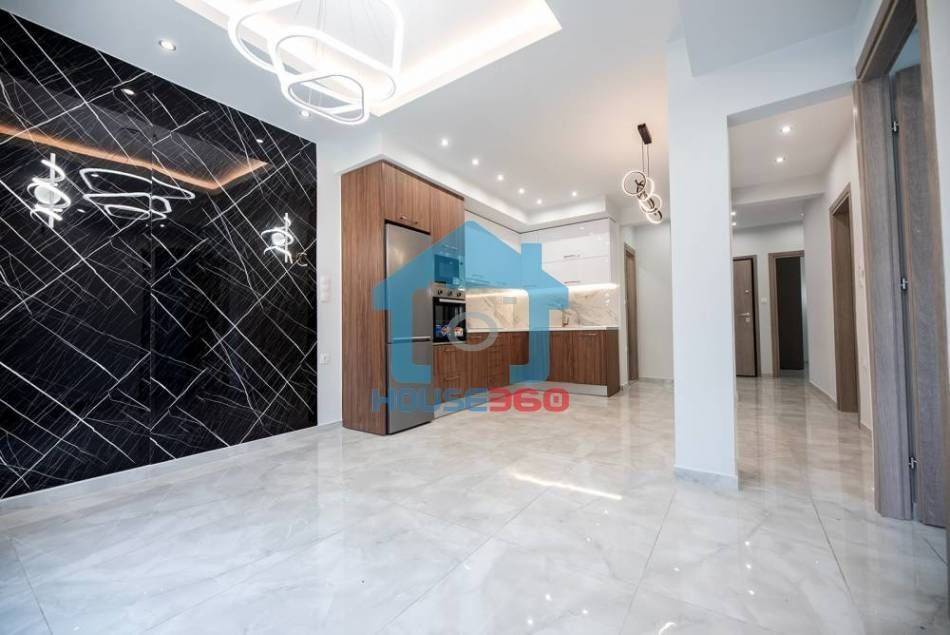 Ο χώρος υποδοχής αναπτύσσεται σε ενιαία διάταξη σαλονιού και κουζίνας, με σύγχρονο σχεδιασμό και ιδιαίτερη έμφαση στη λεπτομέρεια. Η κουζίνα διαθέτει μοντέρνα ντουλάπια, εντοιχισμένες ηλεκτρικές συσκευές και εργονομική διάταξη, ενώ το σαλόνι είναι ιδιαίτερα φωτεινό, με άμεση πρόσβαση σε μπαλκόνι που προσφέρει άνεση και αίσθηση ανοιχτού ορίζοντα.
