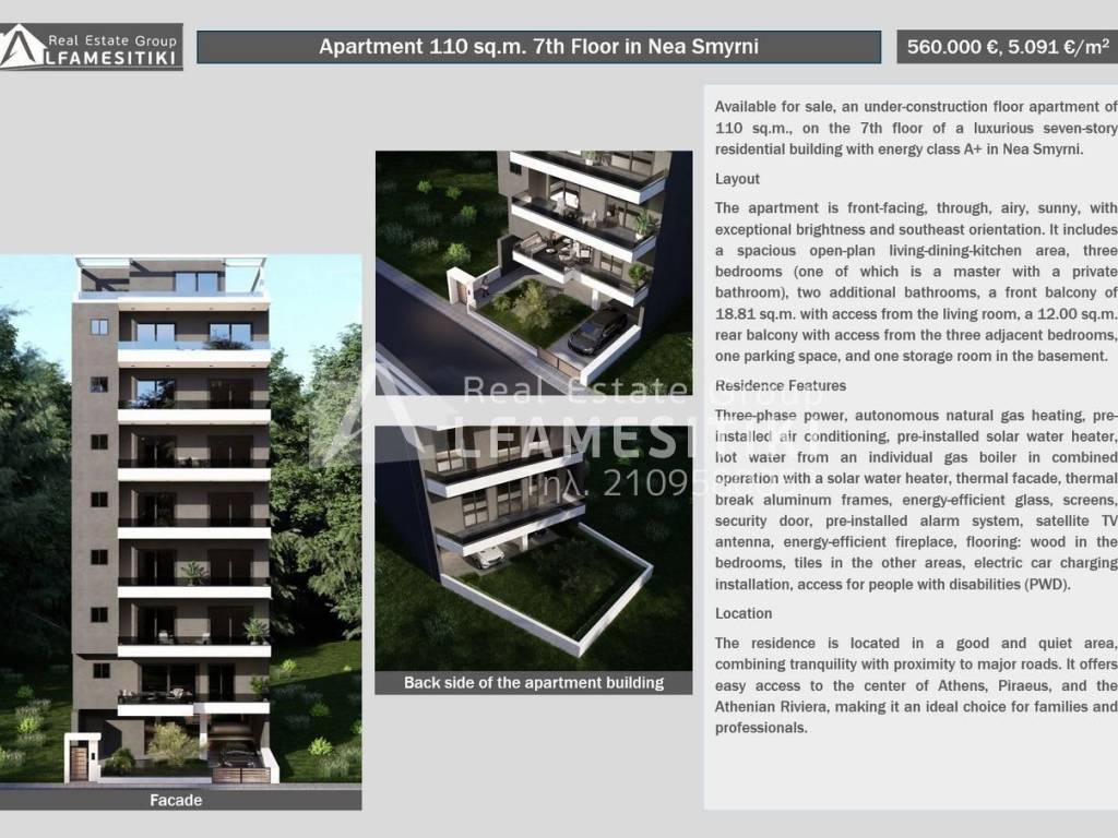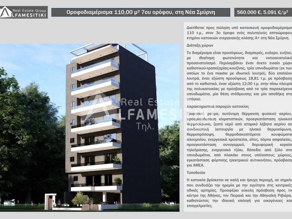 Διατίθεται προς πώληση υπό κατασκευή οροφοδιαμέρισμα 110 τ.μ., στον 7ο όροφο ενός πολυτελούς επταώροφου κτηρίου κατοικιών ενεργειακής κλάσης A+ στη Νέα Σμύρνη. Διάταξη χώρων Το διαμέρισμα είναι προσόψεως, διαμπερές, ευάερο, ευήλιο, με ιδιαίτερη φωτεινότητα και νοτιοανατολικό προσανατολισμό. Περιλαμβάνει έναν άνετο ενιαίο χώρο καθιστικού-τραπεζαρίας-κουζίνας, τρία υπνοδωμάτια (εκ των οποίων το ένα master με ιδιωτικό λουτρό), δύο επιπλέον λουτρά, έναν εξώστη προσόψεως 18,81 τ.μ. με πρόσβαση από το καθιστικό, έναν εξώστη 12,00 τ.μ. στην πίσω πλευρά της πολυκατοικίας με πρόσβαση από τα τρία παρακείμενα υπνοδωμάτια, μία θέση στάθμευσης και μία αποθήκη στο υπόγειο. Χαρακτηριστικά παροχών κατοικίας Τριφασικό ρεύμα, αυτόνομη θέρμανση φυσικού αερίου, προεγκατάσταση κλιματιστικών, προεγκατάσταση ηλιακού θερμοσίφωνα, ζεστό νερό από ατομικό λέβητα αερίου σε συνδυαστική λειτουργία με ηλιακό θερμοσίφωνα, θερμοπρόσοψη, θερμοδιακοπτόμενα κουφώματα αλουμινίου, ενεργειακά κρύσταλλα, σίτες, πόρτα ασφαλείας, προεγκατάσταση συναγερμού, δορυφορική κεραία τηλεόρασης, ενεργειακό τζάκι, δάπεδα: από ξύλο στα υπνοδωμάτια, από πλακάκι στους υπόλοιπους χώρους, εγκατάσταση φόρτισης ηλεκτρικού αυτοκινήτου, πρόσβαση για ΑΜΕΑ. Τοποθεσία Τοποθεσία Η κατοικία βρίσκεται σε καλή και ήσυχη περιοχή, σε σημείο που συνδυάζει την ηρεμία με την εγγύτητα στις κεντρικές οδικές αρτηρίες. Προσφέρει εύκολη πρόσβαση προς το κέντρο της Αθήνας, τον Πειραιά και την Αθηναϊκή Ριβιέρα, καθιστώντας την ιδανική επιλογή για οικογένειες και επαγγελματίες.παραδωση μεσα 2027 ► ALFAMESITIKI Real Estate Group -- Μέλος Συλλόγου Μεσιτών - Πιστοποιημένο Μεσιτικό Γραφείο ► Για περισσότερες λεπτομέρειες σχετικά με το ακίνητο, το κτίριο ή την περιοχή καθώς και για την επίσκεψη του ακινήτου μπορείτε να επισκεφτείτε την σελίδα - https://www.alfamesitiki.gr/pdetails?id=Α-146268 ► Για ευκαιρίες σε παρόμοια ακίνητα και σε άλλες περιοχές με φωτογραφίες επισκεφτείτε τη σελίδα μας στο alfamesitiki.gr ► Τελευταία ενημέρωση 24/3/2026 ► Ακολουθήστε μας και στο Facebook www.facebook.com/alfamesitiki.gr