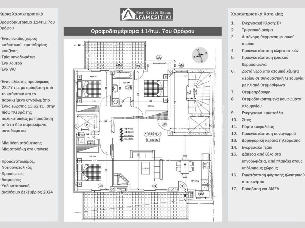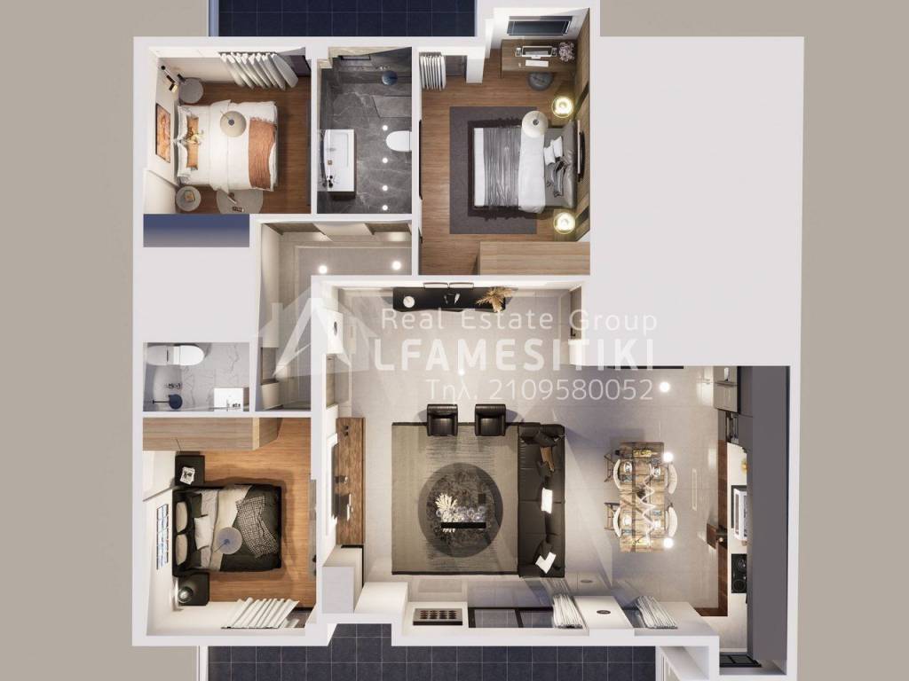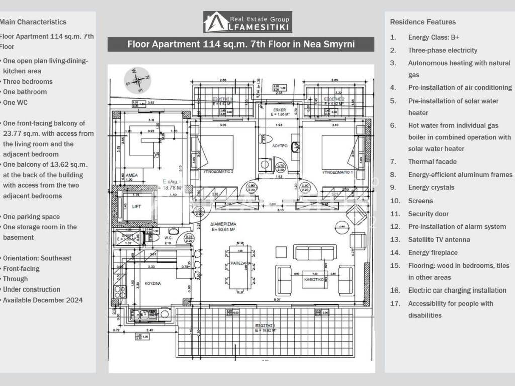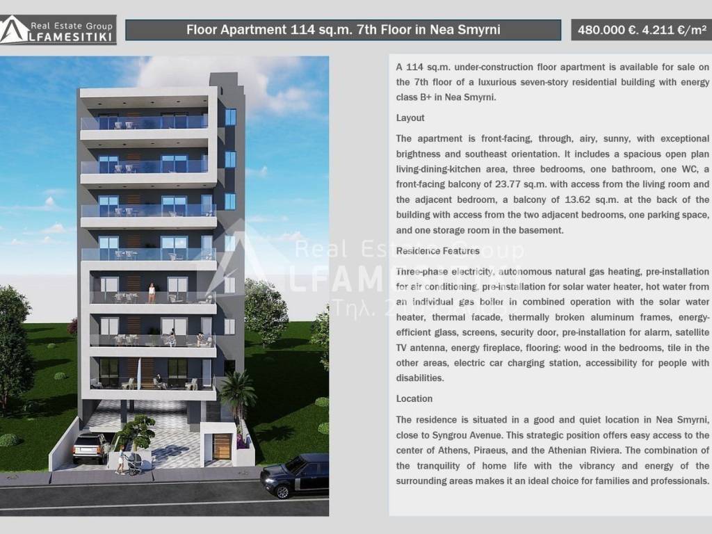 Διατίθεται προς πώληση υπό κατασκευή οροφοδιαμέρισμα 114 τ.μ., στον 7ο όροφο ενός πολυτελούς επταώροφου κτηρίου κατοικιών ενεργειακής κλάσης Β+ στη Νέα Σμύρνη. Διάταξη χώρων Το διαμέρισμα είναι προσόψεως, διαμπερές, ευάερο, ευήλιο, με ιδιαίτερη φωτεινότητα και νοτιοανατολικό προσανατολισμό. Περιλαμβάνει έναν άνετο ενιαίο χώρο καθιστικού-τραπεζαρίας-κουζίνας, τρία υπνοδωμάτια, ένα λουτρό, ένα WC, έναν εξώστη προσόψεως 23,77 τ.μ. με πρόσβαση από το καθιστικό και το παρακείμενο υπνοδωμάτιο, ένας εξώστης 13,62 τ.μ. στην πίσω πλευρά της πολυκατοικίας με πρόσβαση από τα δύο παρακείμενα υπνοδωμάτια, μία θέση στάθμευσης και μία αποθήκη στο υπόγειο. Χαρακτηριστικά παροχών κατοικίας Τριφασικό ρεύμα, αυτόνομη θέρμανση φυσικού αερίου, προεγκατάσταση κλιματιστικών, προεγκατάσταση ηλιακού θερμοσίφωνα, ζεστό νερό από ατομικό λέβητα αερίου σε συνδυαστική λειτουργία με ηλιακό θερμοσίφωνα, θερμοπρόσοψη, θερμοδιακοπτόμενα κουφώματα αλουμινίου, ενεργειακά τζάμια, σίτες, πόρτα ασφαλείας, προεγκατάσταση συναγερμού, δορυφορική κεραία τηλεόρασης, ενεργειακό τζάκι, δάπεδα: από ξύλο στα υπνοδωμάτια, από πλακάκι στους υπόλοιπους χώρους, εγκατάσταση φόρτισης ηλεκτρικού αυτοκινήτου, πρόσβαση για ΑΜΕΑ. Τοποθεσία Η κατοικία βρίσκεται σε μια καλή και ήσυχη τοποθεσία στη Νέα Σμύρνη, σε γειτνίαση με την λεωφόρο Συγγρού. Αυτή η στρατηγική θέση προσφέρει εύκολη πρόσβαση στο κέντρο της Αθήνας, τον Πειραιά και την Αθηναϊκή Ριβιέρα. Ο συνδυασμός της ηρεμίας της οικιακής ζωής με την ζωντάνια και την ενέργεια των γύρω περιοχών την καθιστά ιδανική επιλογή για οικογένειες και επαγγελματίες. ► ALFAMESITIKI Real Estate Group -- Μέλος Συλλόγου Μεσιτών - Πιστοποιημένο Μεσιτικό Γραφείο ► Για περισσότερες λεπτομέρειες σχετικά με το ακίνητο, το κτίριο ή την περιοχή καθώς και για την επίσκεψη του ακινήτου μπορείτε να επισκεφτείτε την σελίδα - https://www.alfamesitiki.gr/pdetails?id=Α-146266 ► Για ευκαιρίες σε παρόμοια ακίνητα και σε άλλες περιοχές με φωτογραφίες επισκεφτείτε τη σελίδα μας στο alfamesitiki.gr ► Τελευταία ενημέρωση 1/4/2026 ► Ακολουθήστε μας και στο Facebook www.facebook.com/alfamesitiki.gr