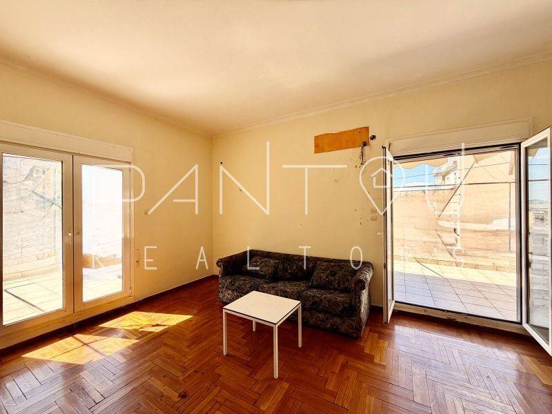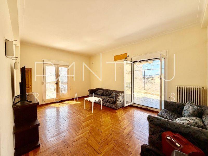 Στον 5ο όροφο επταώροφης πολυκατοικίας του 1957, σε κτίριο που ανεγέρθηκε σε οικόπεδο 293 τ.μ., αυτό το γωνιακό, προσόψεως οροφοδιαμέρισμα 69 τ.μ. προσφέρει κάτι σχεδόν αναπάντεχο για το κέντρο της Αθήνας: φως, ανοιχτωσιά και μια βεράντα-γήπεδο που αλλάζει ριζικά την εμπειρία του χώρου. Δεν πρόκειται για ένα τυπικό αστικό μπαλκόνι διέλευσης. Πρόκειται για εξωτερικό χώρο με πραγματικό εύρος χρήσης — αρκετό για καθιστικό, τραπέζι, φύτευση, απογευματινό φως, αίσθηση ύψους και αστικής ελευθερίας.