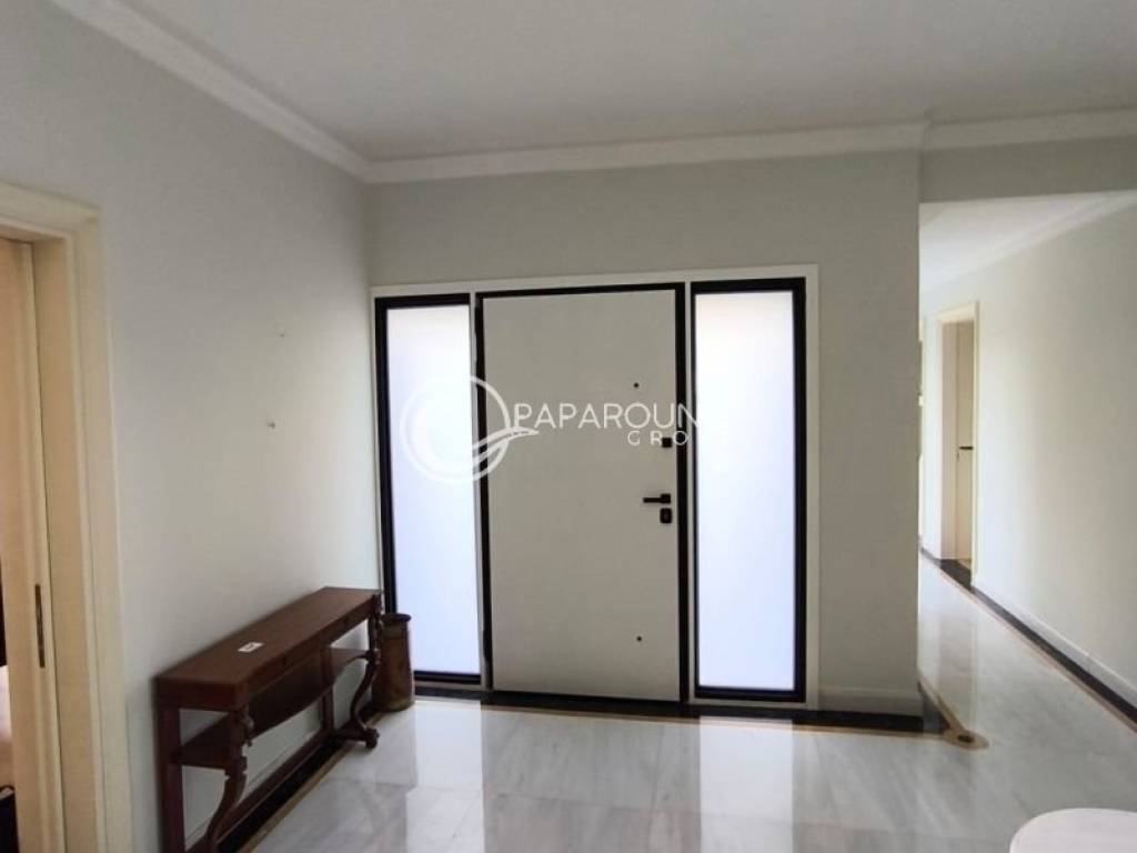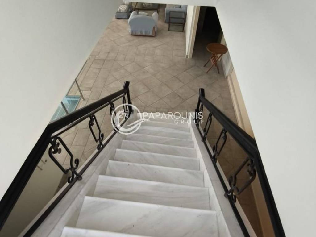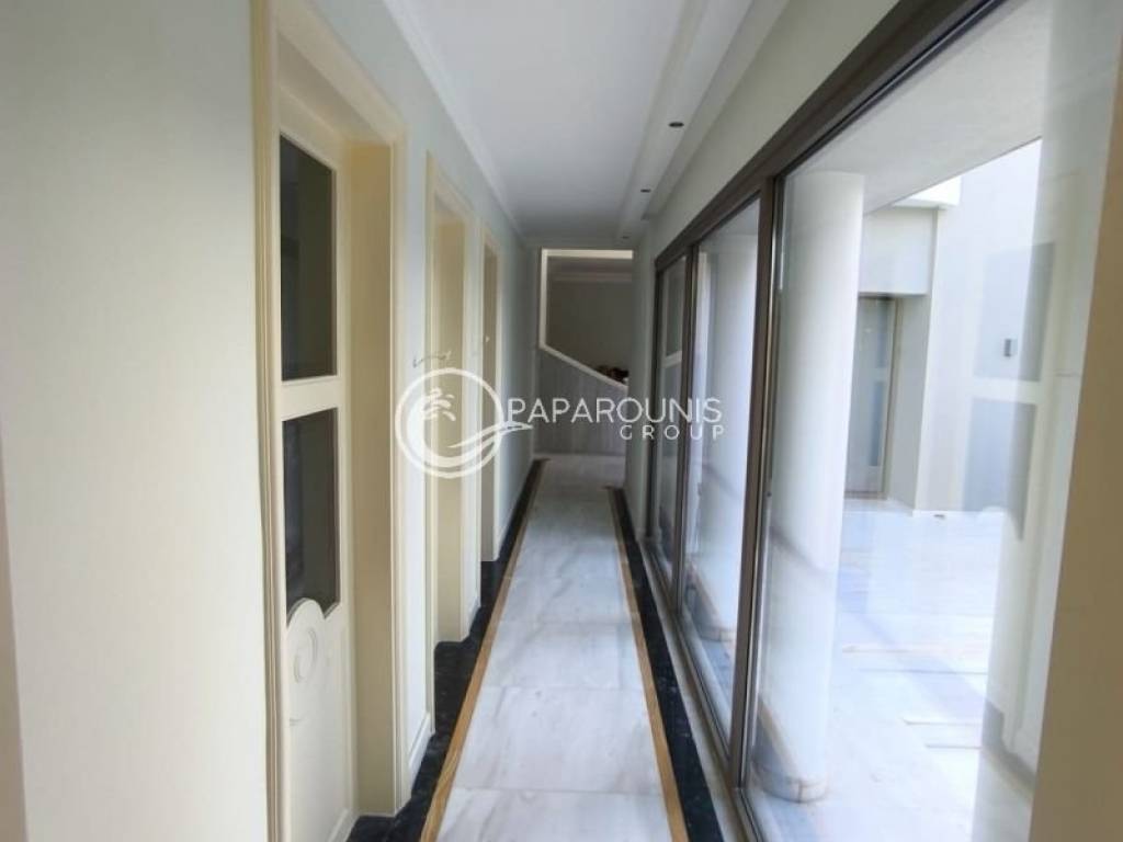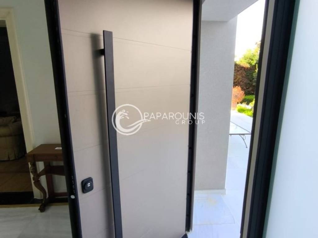 Οι μεγάλες τζαμαρίες αγκαλιάζουν το φως και το αφήνουν να πλημμυρίσει τρυφερά τα τρία σαλόνια του ισογείου, όπου ο χώρος απλώνεται σαν ανάσα βαθιά, ενώ η επίσημη τραπεζαρία και η πλήρως εξοπλισμένη κουζίνα συνδέονται με μια αίσθηση ευγένειας και άνεσης. Η μεγάλη μαρμάρινη σκάλα, επιβλητική και διάφανη σαν σκέψη, κατεβαίνει και ανεβαίνει με την ίδια χάρη που κυλά το νερό. Δίπλα της, δύο υπνοδωμάτια με μπάνιο, ένα γραφείο και ένα ζεστό tv room αγκαλιάζουν την καθημερινότητα με γλυκύτητα και πρακτικότητα.
