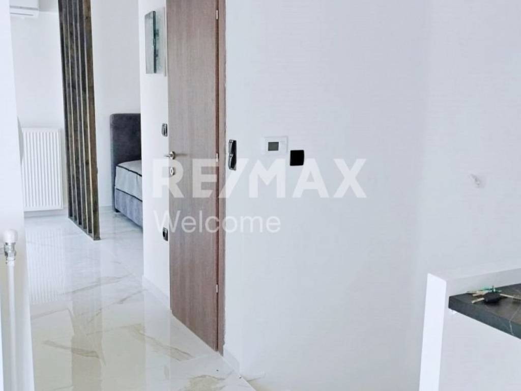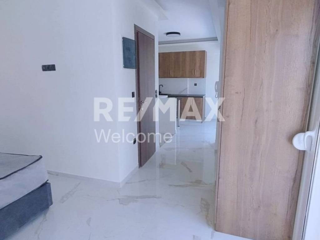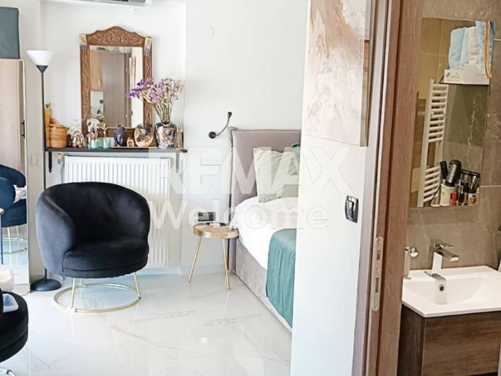 Ο open-plan χώρος συνδυάζει αρμονικά το σαλονάκι με την κρεβατοκάμαρα, ενώ ο μικρός χώρος της κουζίνας και το ευρύχωρο μπάνιο ολοκληρώνουν το σύγχρονο αυτό σύνολο.