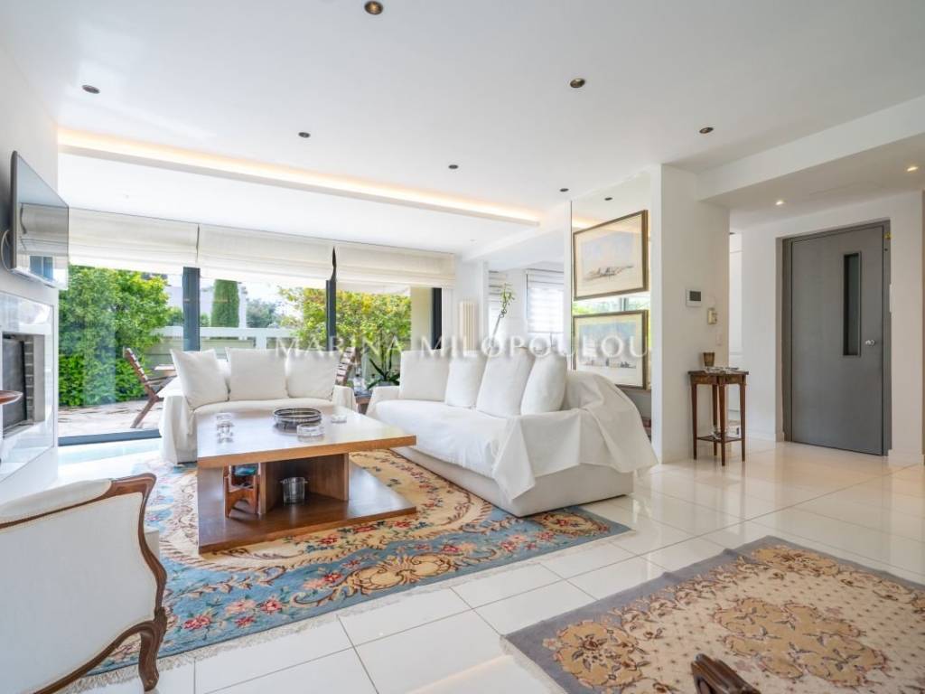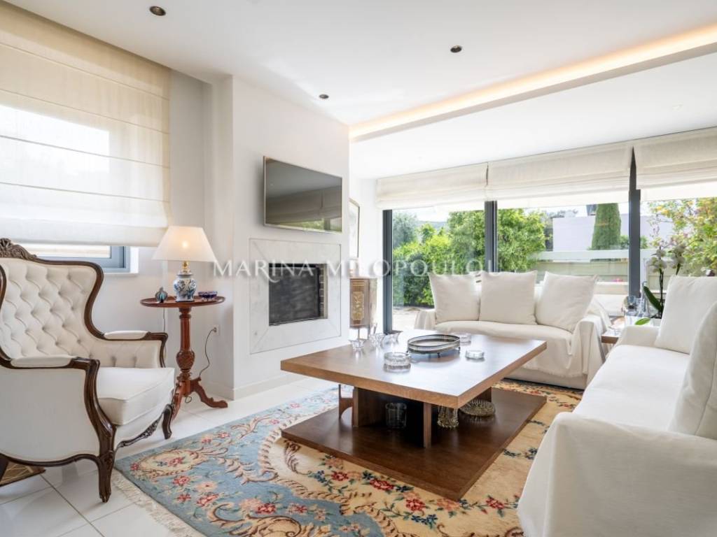 - ισόγειο καθιστικό με τζάκι, ενιαία κουζίνα τα οποία έχουν έξοδο σε μεγάλη αυλή - κήπο με BBQ.