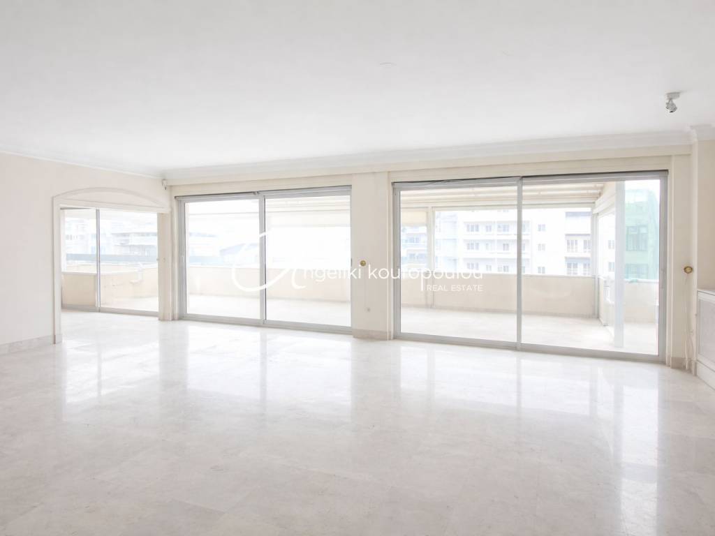 Εμβληματικό διαμέρισμα 300 τ.μ. στον 5ο όροφο, σε επιβλητική πολυκατοικία στην αρχοντική περιοχή των Ανακτόρων. Αναπτύσσεται σε άνετους χώρους υποδοχής με σαλόνι και τζάκι, ξεχωριστή τραπεζαρία και καθιστικό/γραφείο, ενώ διαθέτει ανεξάρτητη κουζίνα με βοηθητικό χώρο και WC επισκεπτών. Η μεγάλη βεράντα με συνεχή ανοίγματα προσφέρει άπλετο φυσικό φως. Περιλαμβάνει 1 υπνοδωμάτιο με en suite μπάνιο, 1 μεγάλο master (με δυνατότητα διαμόρφωσης σε 2 δωμάτια), επιπλέον μπάνιο, γκαρνταρόμπα και αποθηκευτικούς χώρους. Διαθέτει επίσης δωμάτιο υπηρεσίας με δικό του μπάνιο και ανεξάρτητη πρόσβαση. Ακίνητο με χαρακτήρα, εξαιρετική διαρρύθμιση, ιδιωτικότητα και πλούσιο φως.