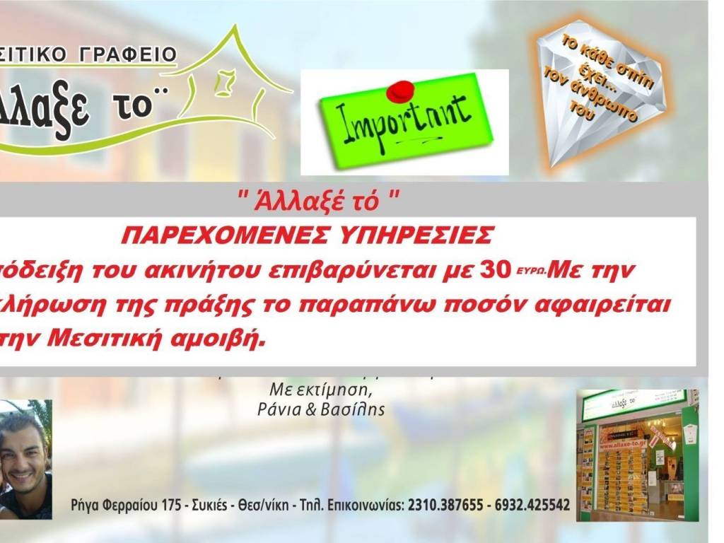 Check the video : https://youtu.be/Wzje_uUUvmk The Presentation - suggestion of the property costs 30 €.(Including Taxes) If you liked the photos and the description, do not forget to watch and listen to the video! Watch and listen to the video as many times as you like here: https://youtu.be/Wzje_uUUvmk or right and bottom to the end of the page. So you know from the beginning if it's worth to seeing it.. It's like you are within the home. SERVICES PROVIDED: The Presentation - suggestion of the property costs 30 €.(Including Taxes) Upon completion of the transaction, the above amount is deducted from the Brokerage Fee. The property is indicated by the demonstration of the police ID. The Presentation of the property at our office is free of charge. The Real Estate Change Office was created by Rania Pappa and Vassilis Kontelis, because when they were looking for a home, they were badly affected by ... realtors. Brokering fees is not the only thing that we care about. We love this job very much and we identify with you as if we were looking for a home for us ... Like Like on our Facebook page and see all opportunities here: https: //www.facebook.com/allaxeto.gr ΥοuTube : https://www.youtube.com/user/MsPaco75 Real Estate Office "Change it" Mobile phone for appointment: Vasilis 00306932425542 {cosmote,viper,what's app} Contact Person: Mr. Vasilis Kontelis Tel.: 00302310387655 Address: Riga Ferraiou 175 Sykies P.C. 56626 Thessaloniki Email: b-kontel@otenet.gr www.allaxe-to.gr