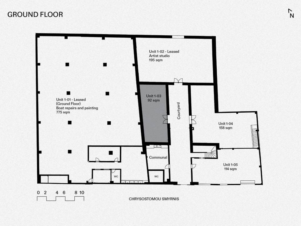 Unit 1.04 Office, store, industrial Kaminos 44, Piraeus 158 sqm Cold shell For lease Ground level space for artistic work, production and manu- facturing, office or storage in Kaminos 44 – a repurposed former ouzo factory in the port city of Piraeus. Overview 158 sqm Cold shell Concrete floor Exposed concrete ceiling 7m ceiling heights Amenities Loading area Shared kitchen and bathrooms Brutal in character, Kaminos 44 provides robust spaces for various forms of artistic endeavour, production and manufacturing. This is one of three spaces available on the ground floor, suitable for artistic work, production and manufacturing, office or storage. Featuring 7-metre high ceilings and shared kitchen and WC facilities. Already on this floor are a sculptor and boat builder and repairs. Kaminos 44 is in the Kaminia neighbourhood of Piraeus, only one kilometre north-east of the port. The streets are a frenetic mix of commercial, residential and industrial activity, where housing, schools, fish tavernas, restaurants and shops co-exist with factories, metalworkers, mechanics and marble yards. Piraeus is a large municipality, with a population of over 170,000, and a thriving shipping hub. It is only 8km from the centre of Athens, seamlessly connected to the rest of Greece and internationally. As well as being an important industrial and commercial centre, it is fast becoming a hub for contemporary art and culture, with several international galleries operating in the area. There are a number of urban regeneration projects in the municipality, including the recently completed Drapsetona cultural park.