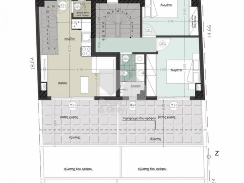 Μεζονέτα έκτου και έβδομου ορόφου σε οικοδομή υπό ανέγερση. Το διαμέρισμα αποτελείται από σαλόνι, κουζίνα και WC τα οποία βρίσκονται στον έκτο όροφο. Το μπάνιο και δυο δωμάτια βρίσκονται στον έβδομο όροφο. Διαθέτει κουφώματα αλουμινίου, ατομικό καυστήρα φυσικού αέριου, πολύ μεγάλη βεράντα με θέα, θέση στάθμευσης, και αποθήκη. Η οικοδομή του διαμερίσματος βρίσκεται σε μια από πιο πλεονεκτικές περιοχές της πόλης, κοντά σε σχολεία και άλλες δραστηριότητες, αλλά σε μια πολύ ήσυχη γειτονιά. Βρίσκεται ανάμεσα σε εμπορικά καταστήματα, 20 μέτρα από κεντρικό οδικό άξονα με πολύ συχνή συγκοινωνία, και μόλις 300 μέτρα από την στάση του ΜΕΤΡΟ. Στην κατασκευή θα χρησιμοποιηθούν τα πιο σύγχρονα υλικά και θα εφαρμοστούν οι πιο σύγχρονες τεχνολογίες.