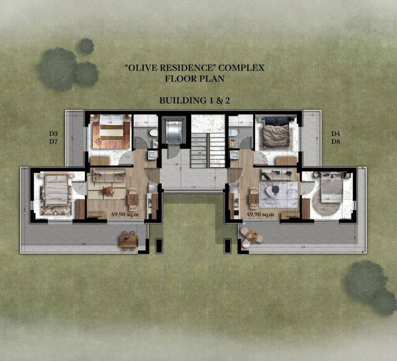 • 14 Διαμερίσματα ορόφου 49,90 τ.μ που αποτελούνται από σαλοκουζίνα, 2 υπνοδωμάτια και 1 μπάνιο.