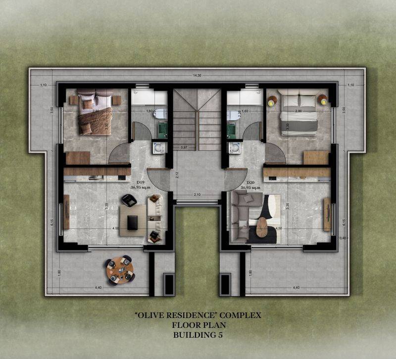 • 12 Διαμερίσματα ορόφου από 36,95τ.μ. έως 37,52τ.μ. που αποτελούνται από σαλοκουζίνα, 1 υπνοδωμάτιο και 1 μπάνιο.