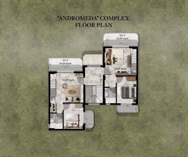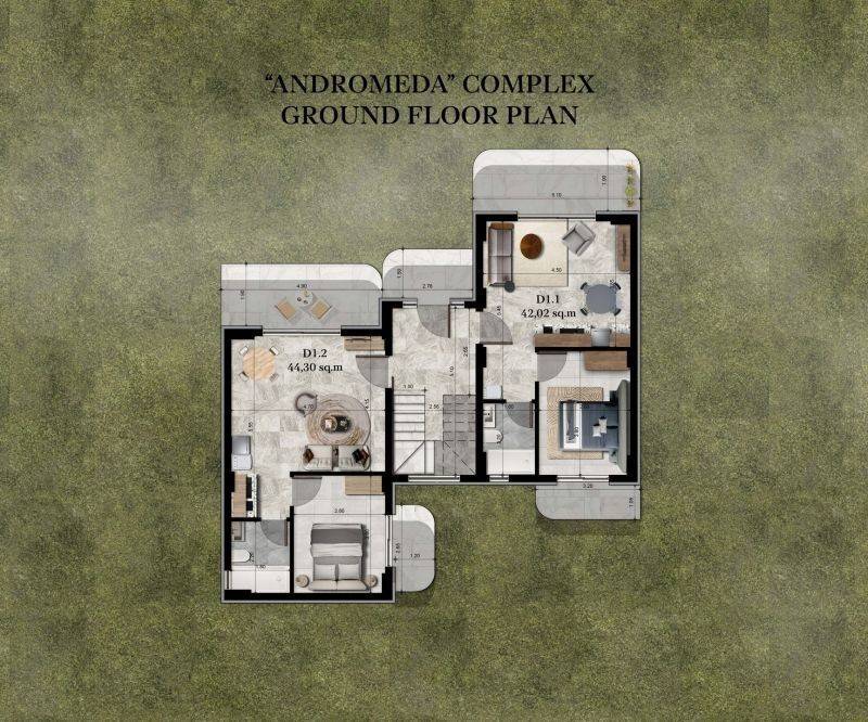 • 6 Διαμερίσματα ισογείου από 39,50τ.μ. έως 44,30τ.μ, που αποτελούνται από σαλοκουζίνα,1 υπνοδωμάτιο,1 μπάνιο.