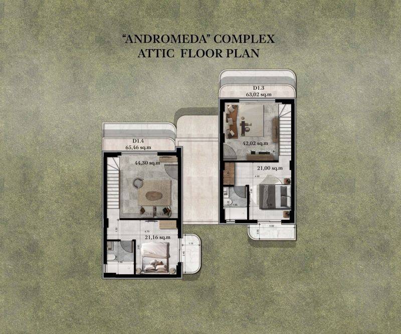 • 7 Διαμερίσματα ορόφου με σοφίτα από 55,45τ.μ.έως 65,46τ.μ, που αποτελούνται από σαλοκουζίνα, 2 υπνοδωμάτια, 2 μπάνια.