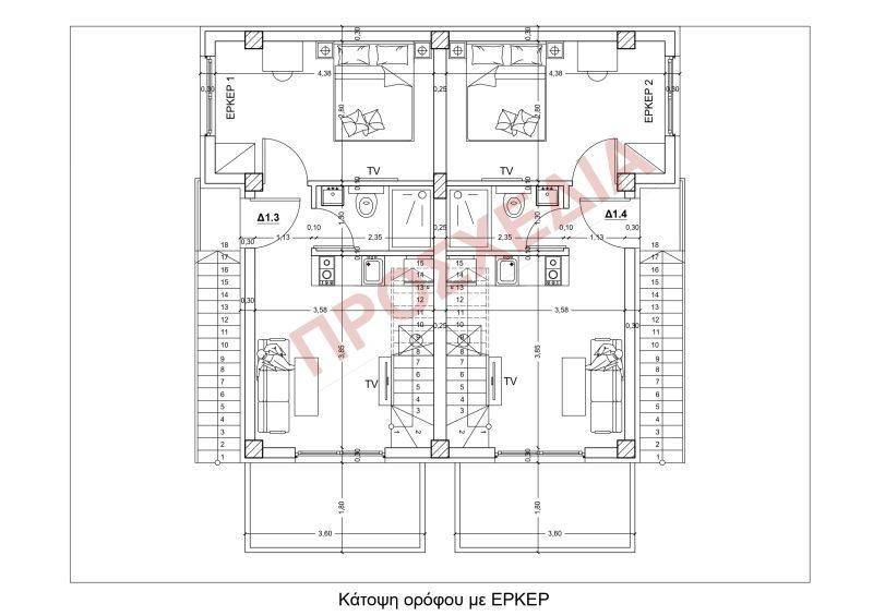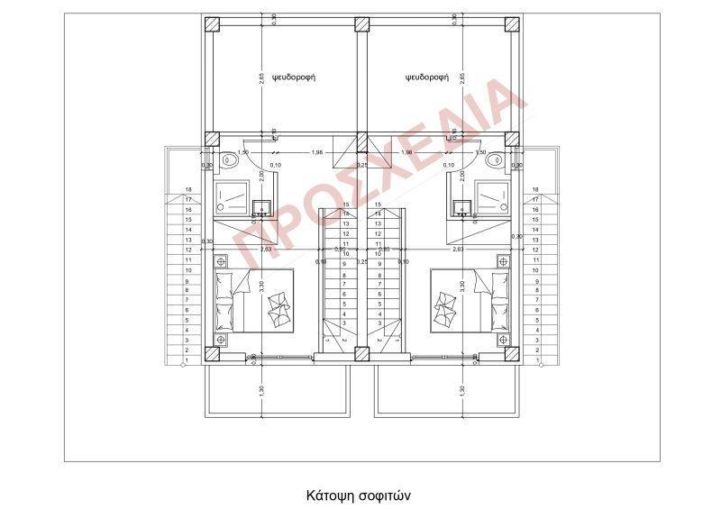 • 2 Διαμερίσματα ορόφου με σοφίτα 57,26τ.μ, που αποτελούνται από σαλοκουζίνα, 2 υπνοδωμάτια, 2 μπάνια.
