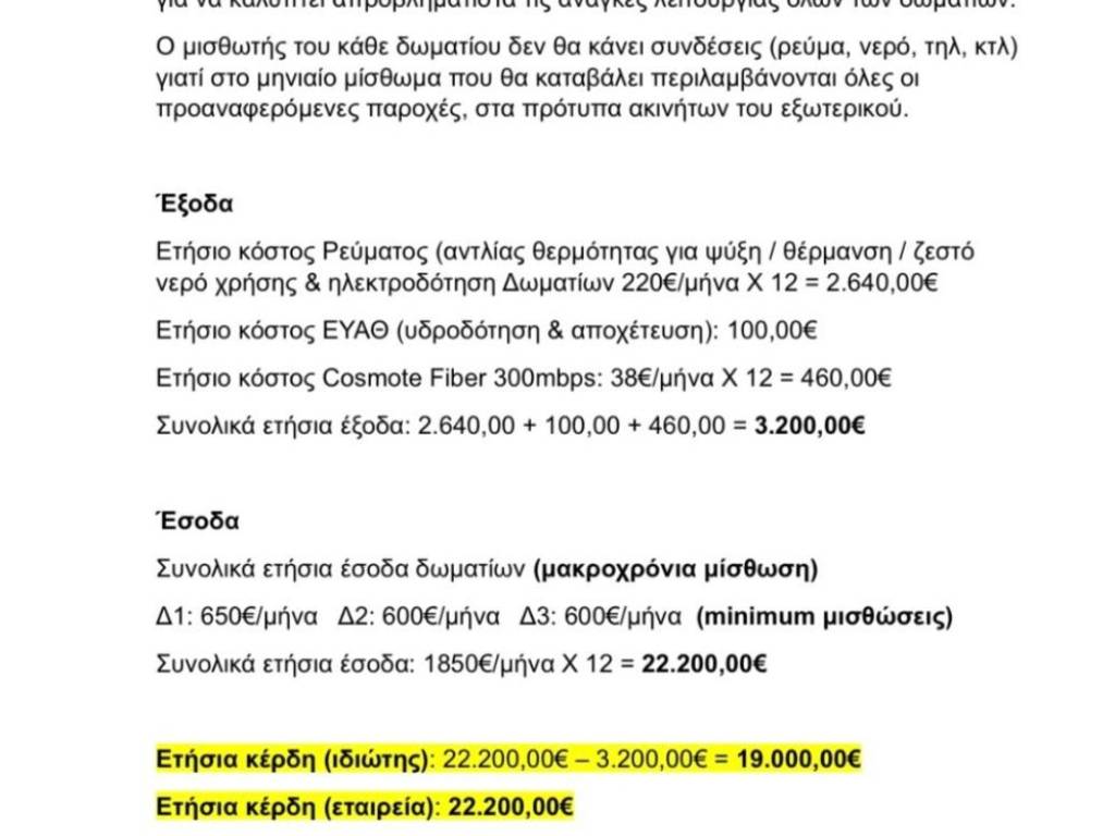 Διατίθενται προς πώληση τρία ισόγεια διαμερίσματα, πλήρως ανακαινισμένα και επιπλωμένα, στην περιοχή της Τούμπας, επί της οδού Ρόδου. Το συγκρότημα αποφέρει αυτή τη στιγμή μηνιαίο εισόδημα 1.750€ από ενοίκια. Η πώληση αφορά και τα τρία διαμερίσματα μαζί, αποτελώντας εξαιρετική ευκαιρία για επένδυση ή ιδιοκατοίκηση. Ένα διαμέρισμα 35 τ.μ. Δύο διαμερίσματα των 30 τ.μ. Πλήρως ανακαινισμένα Επιπλωμένα με μοντέρνο σχεδιασμό Εξοπλισμένα με επώνυμες ηλεκτρικές συσκευές Τοποθετούνται σε ήσυχη αλλά κεντρική περιοχή της Τούμπας, με άμεση πρόσβαση σε καταστήματα, ΜΜΜ και πανεπιστημιακές σχολές. Κατάλληλα για μακροχρόνια ή βραχυχρόνια μίσθωση με εξαιρετική απόδοση. Στοιχεία ακινήτου - Αντλία Θερμότητας MDV 12 KW (ΖΝΧ & Θέρμανση & Ψύξη) εξαιρετικά χαμηλής κατανάλωσης - Βuffer Τank (Χ2) 250 lt έκαστο για συλλογή & αποθήκευση ζεστού - κρύου νερού - Κρυφά επίτοιχα fan-coil (κλιματισμός) – όχι απλή ψύξη / θέρμανση - Ιnternet 300mbps οπτική ίνα (ethernet & access point ξεχωριστά για κάθε σουίτα) - Αισθητήρες – μετρητές κατανάλωσης για κάθε σουίτα & κοινόχρηστους χώρους - Κουφώματα αλουμινίου πλήρως θερμομονωτικά => EXALCO, ALBIO 109C με υάλωση 4- 16-4 (διπλό ενεργειακό) με ηλεκτρικά ρολά αλουμινίου, με κουνουπιέρες - Θωρακισμένες πόρτες (Ιταλικές) σε σουίτες & κεντρικής εισόδου με επένδυση αλουμινίου, επαναφορέα-ηλεκτρ. κυπρί, μεγάλη μπάρα λαβής, κτλ - Αισθητήρες κίνησης για αυτόματο φωτισμό σε όλους τους κοινόχρηστους χώρους (προκήπιοείσοδος-διάδρομος-πίσω ακάλυπτος) - Αισθητήρες φωτός για αυτόματο περιμετρικό φωτισμό περίφραξης (προκήπιο & πίσω ακάλυπτος) - Αυστριακές κουζίνες EGGER με γερμανικά περιφερειακά & push-pull μηχανισμούς - Επώνυμες ηλεκτρικές συσκευές σε κάθε κουζίνα: Sanitec Νεροχύτης, Orabella Sogno Μπαταρία νεροχύτη, Robin Domino Αυτόνομη Κεραμική Εστία, Inventor Ψυγείο, Tefal Ηλεκτρικός Φούρνος, Pyramis Απορροφητήρας Συρόμενος, Χωνευτός Led κρυφός φωτισμός (4000κ) - Ιταλικά πλακάκια (120Χ120) IMOLA AZUMA στον κοινόχρηστο διάδρομο και Ιταλικά πλακάκια απομίμηση ξύλου (20Χ120) WALKYRIA OAK MAT σε όλες τις σουίτες - Λουτρά με κρυφούς φωτισμούς & απλίκες, πλακίδια 60Χ120 μέχρι το ταβάνι, επενδυμένες εσοχές ντουζιέρας με πλακίδια, Ideal Standard Connect Space Λεκάνες Κρεμαστές με Slim Κάλυμμα Soft Close, χωνευτά καζανάκια Geberit Sigma, Χειροποίητα έπιπλα με νεροχύτες, Roca Fayans μπαταρίες νιπτήρα & ντουζιέρας, αθόρυβος εξαερισμός λουτρού με tamper βαλβίδα αντεπιστροφής οσμών, κτλ - Εσωτερικές πόρτες με λευκό laminate A’ ποιότητας (κάσωμα από ανθυγρό πλακάζ θαλάσσης απομίμμηση λάκας) - Επώνυμα φωτιστικά σε όλους τους χώρους (διάδρομος, σουίτες, προκήπιο, πίσω ακάλυπτος) όλα προεγκατεστημένα με led χαμηλής κατανάλωσης, όλα 4000κ. - Εσωτερικά για την κάθε σουίτα έχει εκπονηθεί μελέτη φωτισμού (φωτιστικά οροφής, απλίκες, κρυφοί - χωνευτοί φωτισμοί) - Θυροτηλεόραση έγχρωμη – ψηφιακή με 7’’ monitor με wifi, σε κάθε σουίτα - Κλειστό κύκλωμα με 4 κάμερες Tiandy έγχρωμες full HD 1080p & καταγραφικό 2 ΤΒ με απομακρυσμένη πρόσβαση στον διαχειριστή. Παραδίδεται με όλες τις σουίτες πλήρως επιπλωμένες καθώς επίσης και όλα τα ηλεκτρικά και ηλεκτρονικά (εκτός προσωπικών συσκευών). Η κάθε σουίτα θα περιλαμβάνει γωνιακό καναπέ - κρεβάτι, τραπέζι σαλονιού, τηλεόραση LG 43’’, τραπέζι φαγητού με 2 στάντ, γραφείο – μπουντουάρ, ξεχωριστό χώρο με κρεβάτι 120χ200, ανατομικό στρώμα εταιρίας terzostrom Όπως εμφαίνεται στις φωτογραφίες του ακινήτου οι κοινόχρηστοι χώροι της ιδιοκτησίας (προκήπιοείσοδος-διάδρομος-πίσω ακάλυπτος) είναι π